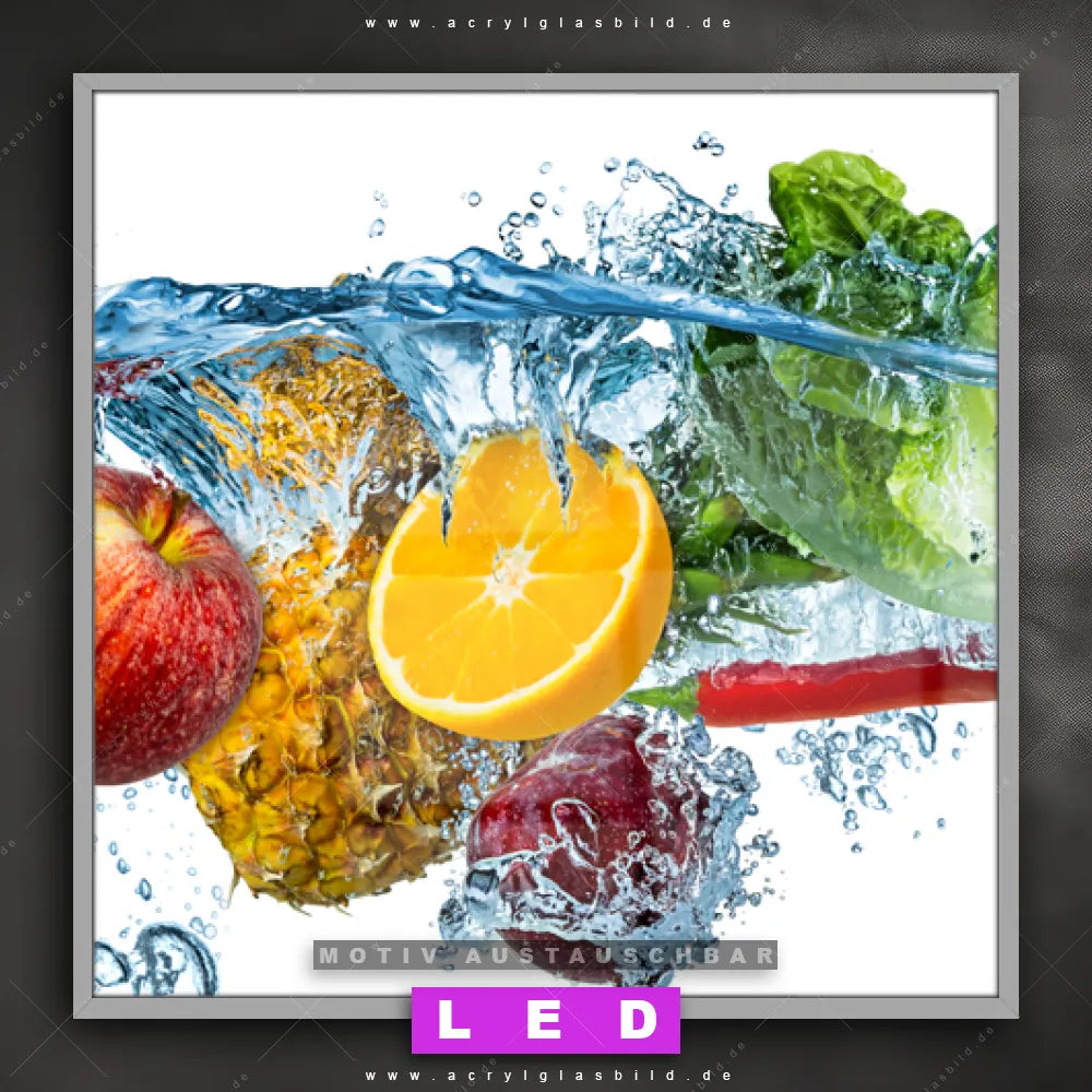 Vergiss dunkle Ecken und Langeweile! Mit unserem Acrylglasbild buntes Obst & Gemüse und seiner brillanten LED-Ausleuchtung wirst du dich nie wieder in der Dunkelheit verirren. Wenn du auf der Suche nach einem beleuchteten Wandbild aus Acrylglas mit Obst, Zitrusfrüchte, Früchte, frisch, spritzig, Spritzwasser, Wasser, Spritzer, Tropfen, Wassertropfen, Orange, Apfel, Zitrone, Gemüse bist, ist unser LED Acrylglasbild Canvalight® DIA Früchte im Wasserstrahl mit den strahlenden Motiv-Farben Bunt, Weiss, Blau, Gelb , Grün, Hellblau, Hellgrün, Orange, Rot, Rosa genau das richtige Leuchtbild für dich. Das im Mixed Media, Modern Art Stil gestaltete LED Bild mit glänzender Front aus Acrylglas passt perfekt zu jedem Einrichtungsstil in Bar - Gastronomie, Küche - Esszimmer – vom minimalistischen Chic bis zum kreativen Chaos.