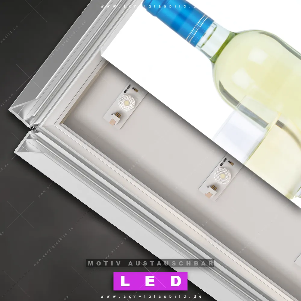 Du suchst nach einem Wandbild mit LED Beleuchtung als ultimativen Hingucker für deine Wände? Dann haben wir das perfekte dimmbare LED Bild mit Fernbedienung und optionaler Farbtemperatursteuerung für dich: unser abgefahrenes Essen - Trinken Canvalight® DIA LED Acrylglasbild! Mit dem LED Leuchtbild aus Acrylglas Wein in Flaschen und Gläsern im Hochformat mit austauschbarer bedruckter Acrylglas-Scheibe bringst du nicht nur Licht, sondern auch ordentlich Stil in deine Bude.