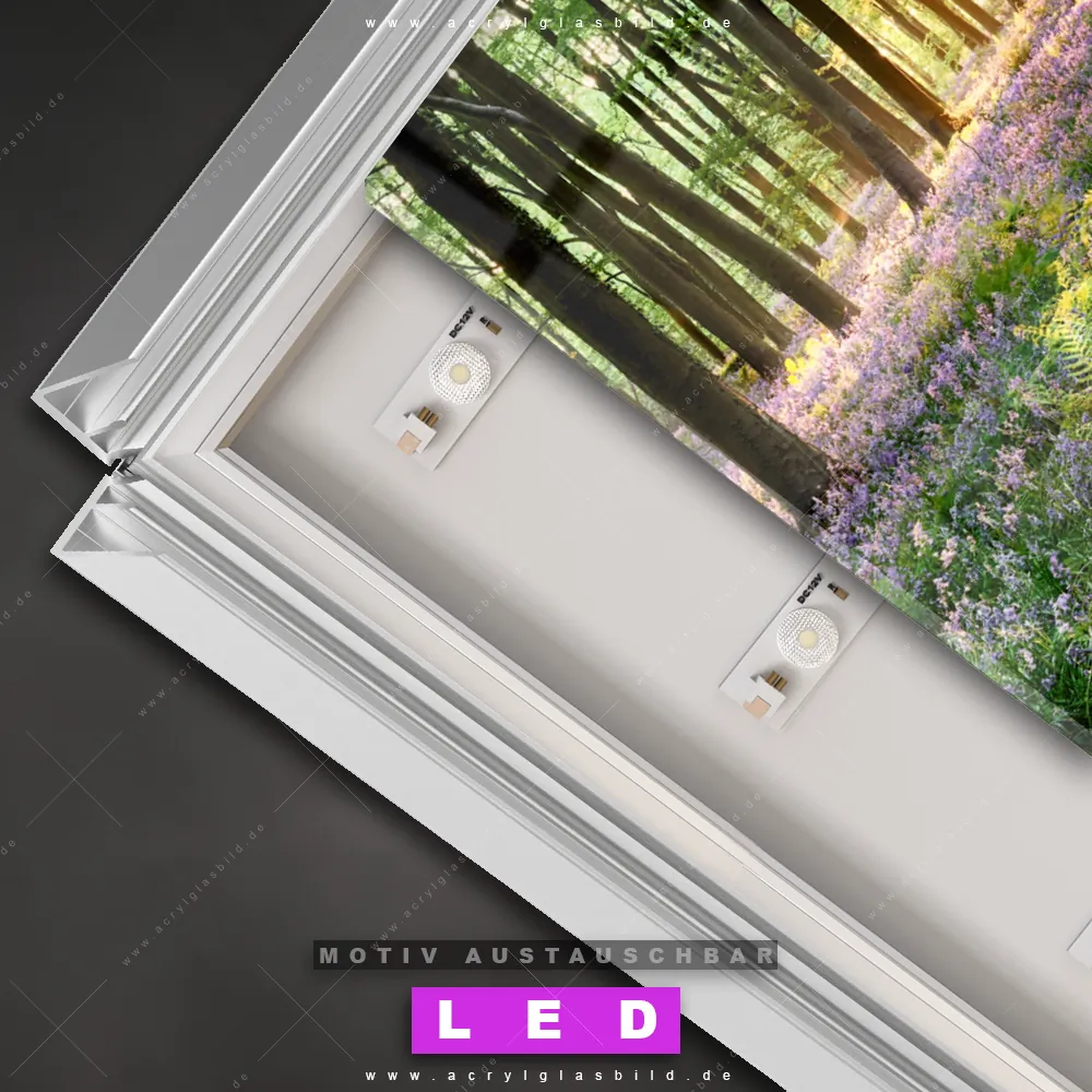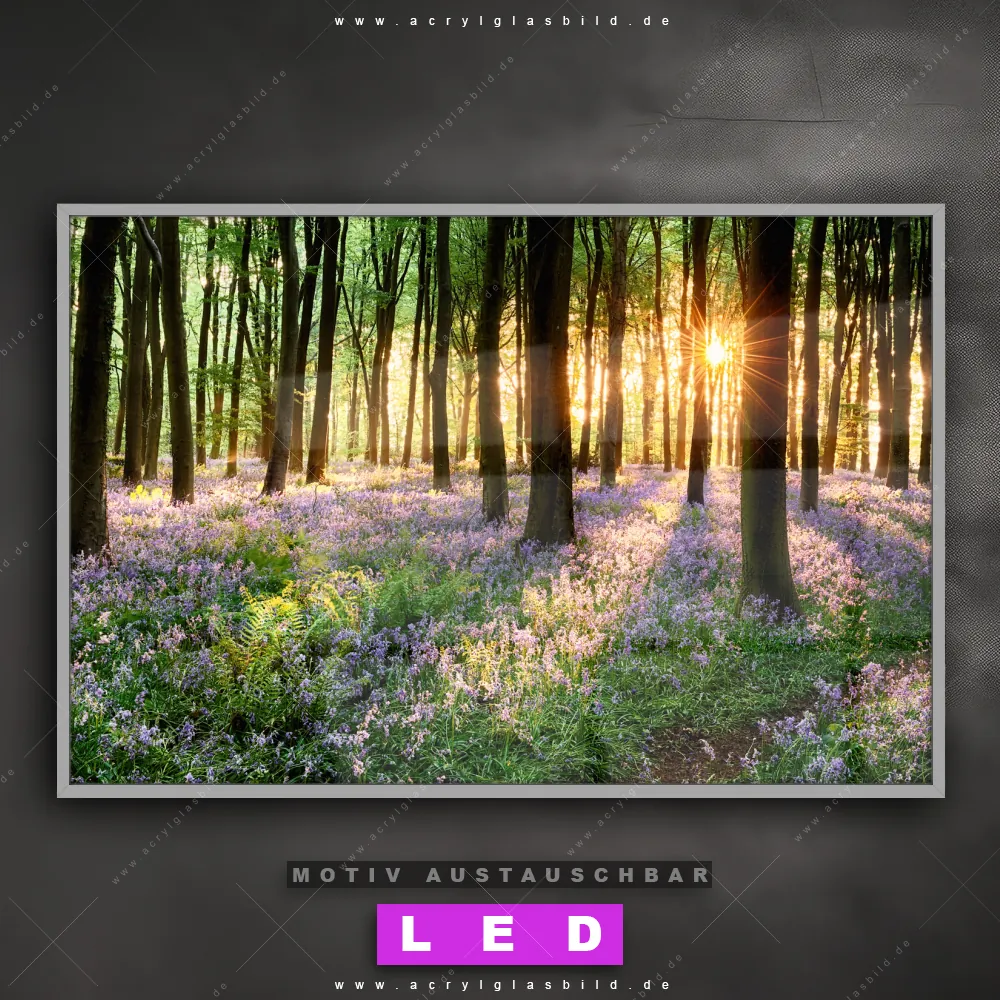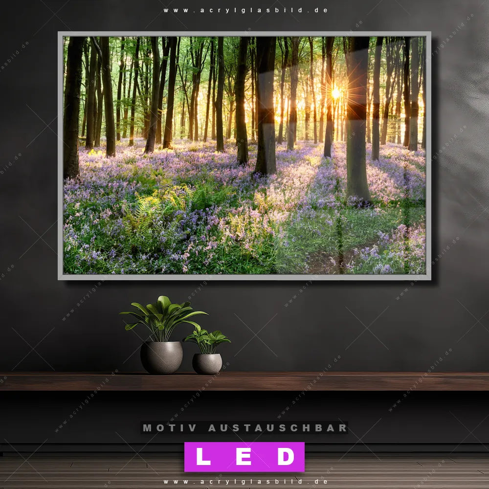 Du bist auf der Suche nach einem dimmbaren Blumen - Botanik, Landschaften, Wald - Bäume LED Bild mit Fernbedienung und optionaler Farbtemperatursteuerung? Dann haben wir hier genau das richtige Wandbild mit LED Beleuchtung für dich: Unser Canvalight® DIA LED Acrylglasbild Blühender Wald bei Sonnenaufgang im Querformat mit austauschbarer bedruckter Acrylglas-Scheibe. Dieses Leuchtbild bringt sofort Partybeleuchtung in deine Räume!