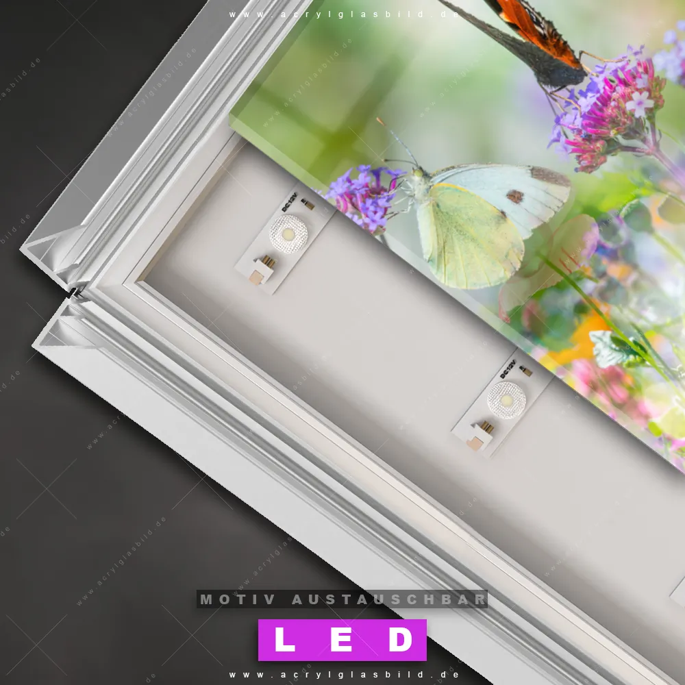 Du bist auf der Suche nach einem dimmbaren Landschaften, Blumen - Botanik LED Bild mit Fernbedienung und optionaler Farbtemperatursteuerung? Dann haben wir hier genau das richtige Wandbild mit LED Beleuchtung für dich: Unser Canvalight® DIA LED Acrylglasbild Blumenwiese mit Schmetterlingen im Querformat mit austauschbarer bedruckter Acrylglas-Scheibe. Dieses Leuchtbild bringt sofort Partybeleuchtung in deine Räume!