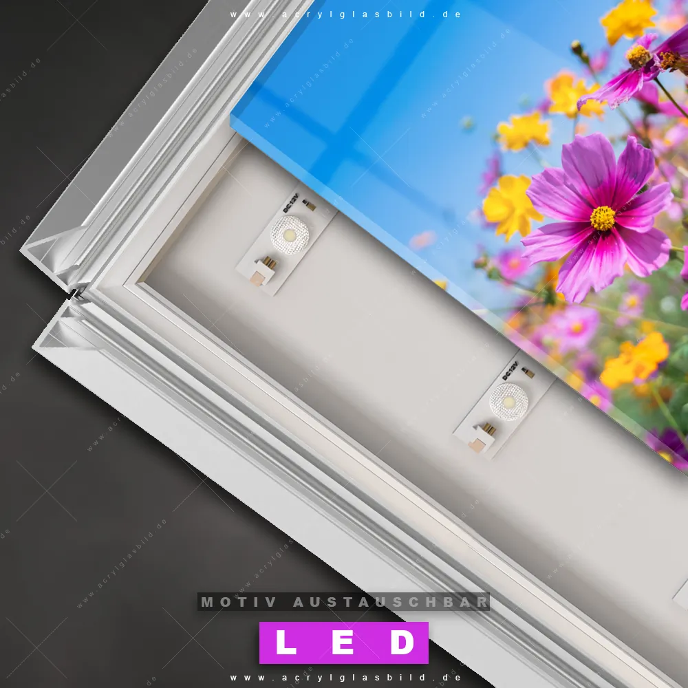 Also, worauf wartest du noch? Gib mit einem beleuchteten Wandbild mit wechselbarer Acrylglas-Scheibe deinen Wänden das gewisse Etwas und bestelle jetzt das LED Acrylglasbild Canvalight® DIA Wiese mit bunten Blumen – dein Zuhause wird es dir danken und deine Freunde werden dank der wechselbaren Motive erblassen!