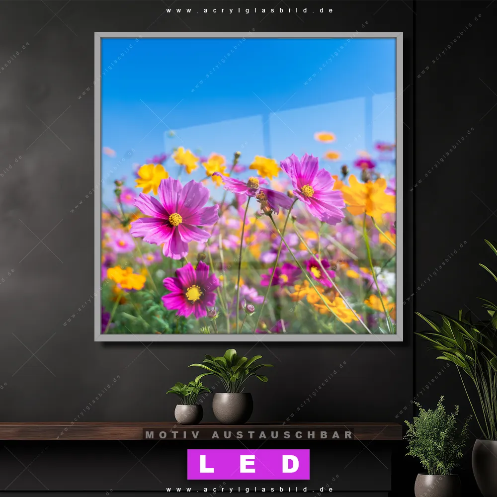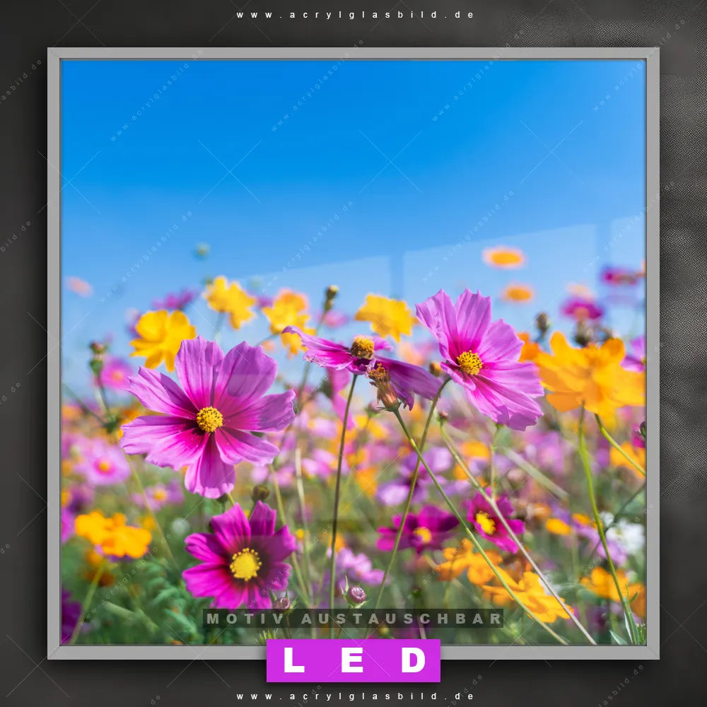 Bist du bereit, deine Wände mit einem dimmbaren LED Bild mit Fernbedienung und optionaler Farbtemperatursteuerung zum Leuchten zu bringen? Wir haben das ultimative Landschaften, Blumen - Botanik LED Acrylglasbild Canvalight® DIA für dich! Unser LED Wandbild aus Acrylglas Blumenwiese unter blauem Himmel im Quadratischen Format mit austauschbarer bedruckter Acrylglas-Scheibe im DIA-Klapprahmen bringt sofort jede Menge Glanz in deine vier Wände.