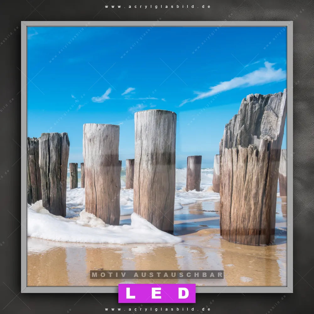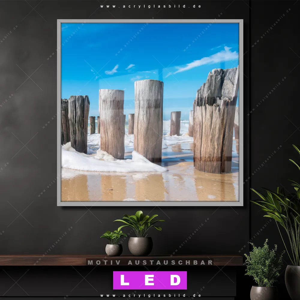 Bist du bereit, deine Wände mit einem dimmbaren LED Bild mit Fernbedienung und optionaler Farbtemperatursteuerung zum Leuchten zu bringen? Wir haben das ultimative Strand - Meer, Landschaften LED Acrylglasbild Canvalight® DIA für dich! Unser LED Wandbild aus Acrylglas Buhnen in Wellen am Strand im Quadratischen Format mit austauschbarer bedruckter Acrylglas-Scheibe im DIA-Klapprahmen bringt sofort jede Menge Glanz in deine vier Wände.