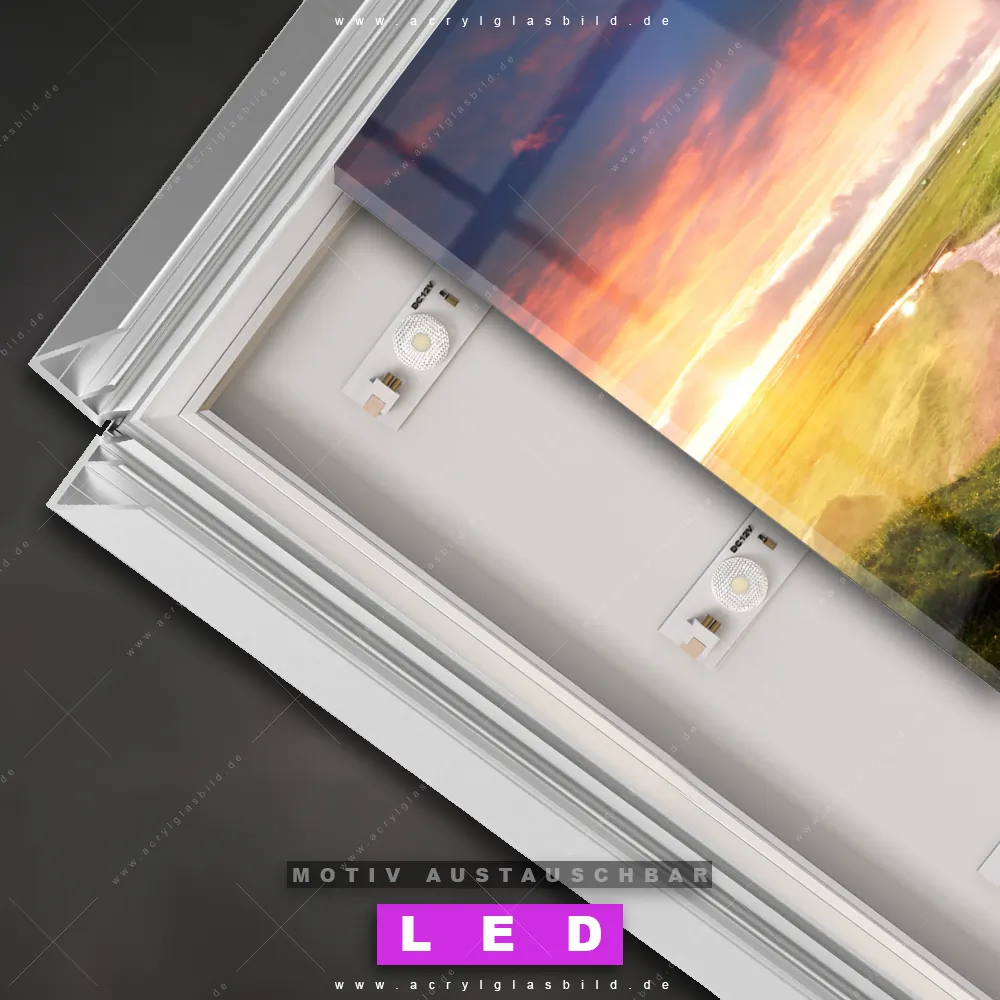 Also, worauf wartest du noch? Gib mit einem beleuchteten Wandbild mit wechselbarer Acrylglas-Scheibe deinen Wänden das gewisse Etwas und bestelle jetzt das LED Acrylglasbild Canvalight® DIA Wasserfall im Sonnenuntergang – dein Zuhause wird es dir danken und deine Freunde werden dank der wechselbaren Motive erblassen!