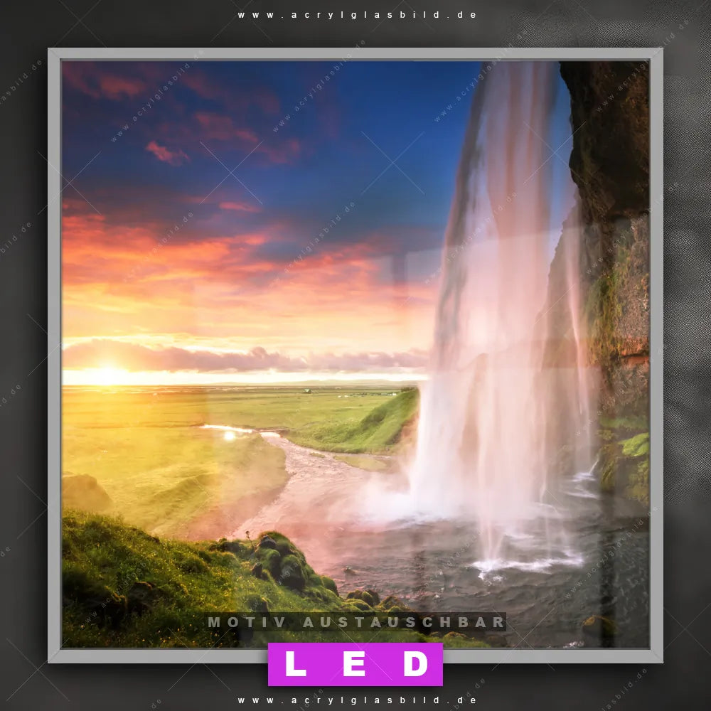 Bist du bereit, deine Wände mit einem dimmbaren LED Bild mit Fernbedienung und optionaler Farbtemperatursteuerung zum Leuchten zu bringen? Wir haben das ultimative Landschaften LED Acrylglasbild Canvalight® DIA für dich! Unser LED Wandbild aus Acrylglas Isländischer Wasserfall im Quadratischen Format mit austauschbarer bedruckter Acrylglas-Scheibe im DIA-Klapprahmen bringt sofort jede Menge Glanz in deine vier Wände.