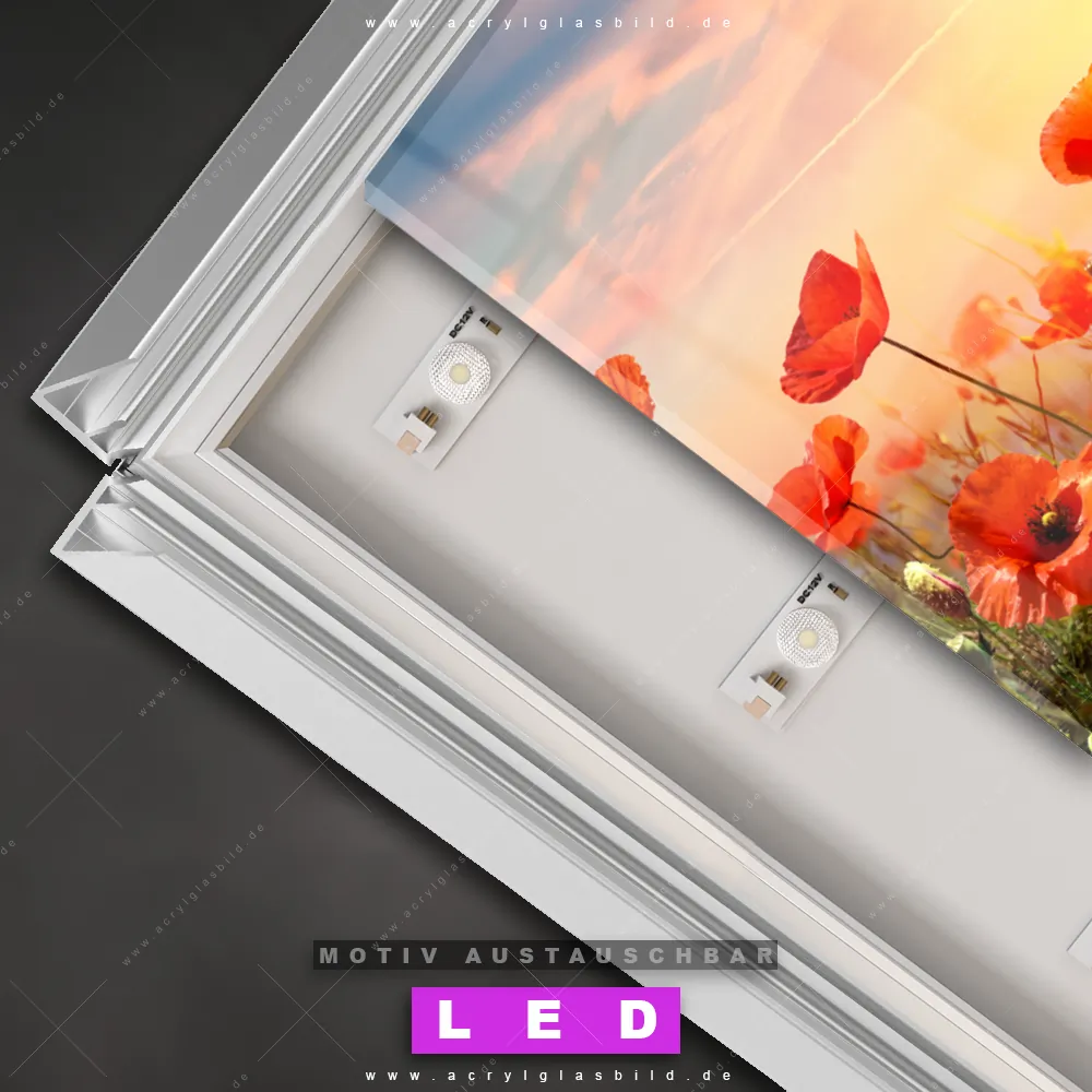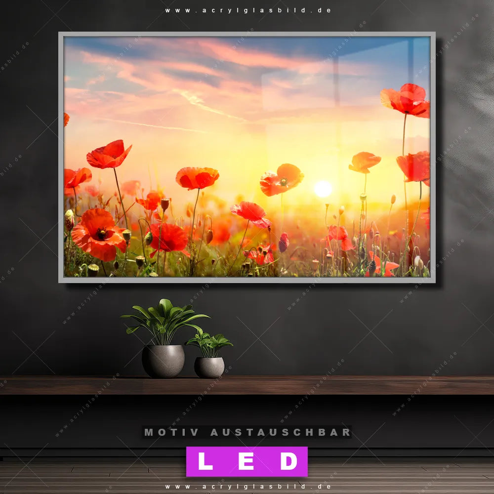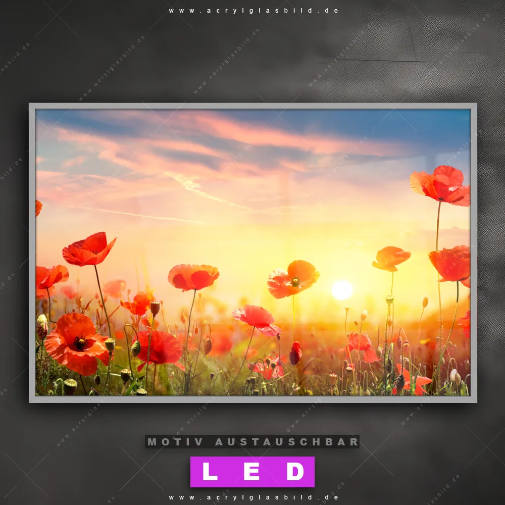 Du bist auf der Suche nach einem dimmbaren Landschaften, Blumen - Botanik LED Bild mit Fernbedienung und optionaler Farbtemperatursteuerung? Dann haben wir hier genau das richtige Wandbild mit LED Beleuchtung für dich: Unser Canvalight® DIA LED Acrylglasbild Mohnblumenfeld bei Sonnenuntergang im Querformat mit austauschbarer bedruckter Acrylglas-Scheibe. Dieses Leuchtbild bringt sofort Partybeleuchtung in deine Räume!