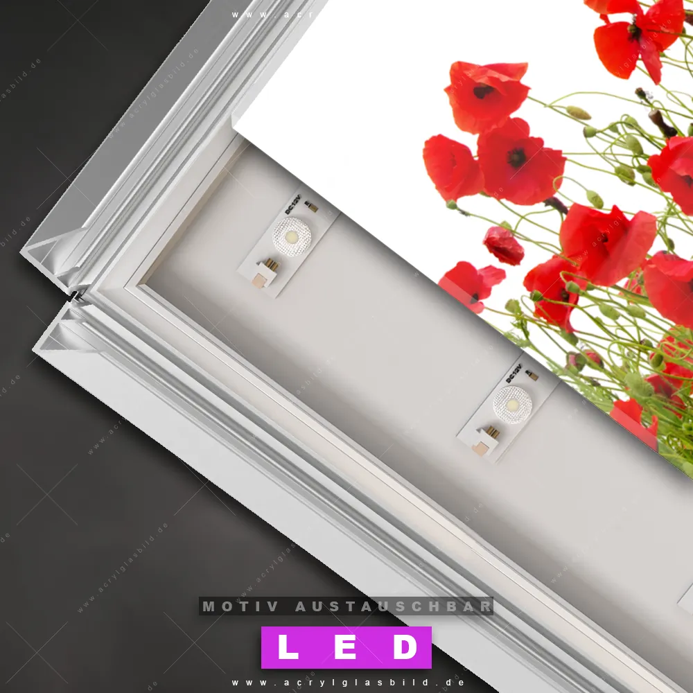 Du bist auf der Suche nach einem dimmbaren Landschaften, Blumen - Botanik LED Bild mit Fernbedienung und optionaler Farbtemperatursteuerung? Dann haben wir hier genau das richtige Wandbild mit LED Beleuchtung für dich: Unser Canvalight® DIA LED Acrylglasbild Mohnfeld im Querformat mit austauschbarer bedruckter Acrylglas-Scheibe. Dieses Leuchtbild bringt sofort Partybeleuchtung in deine Räume!