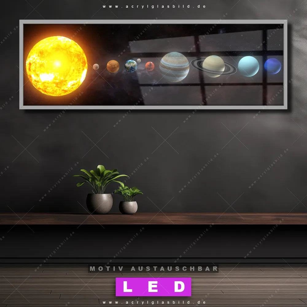 Also, worauf wartest du noch? Verwandle deine Wände mit einem LED Leuchtbild in wahre Kunstwerke und bestelle jetzt das Canvalight® DIA LED Acrylglasbild Planeten im Sonnensystem. Deine Wände werden strahlen, und deine Freunde werden dank der wechselbaren Motive staunen!