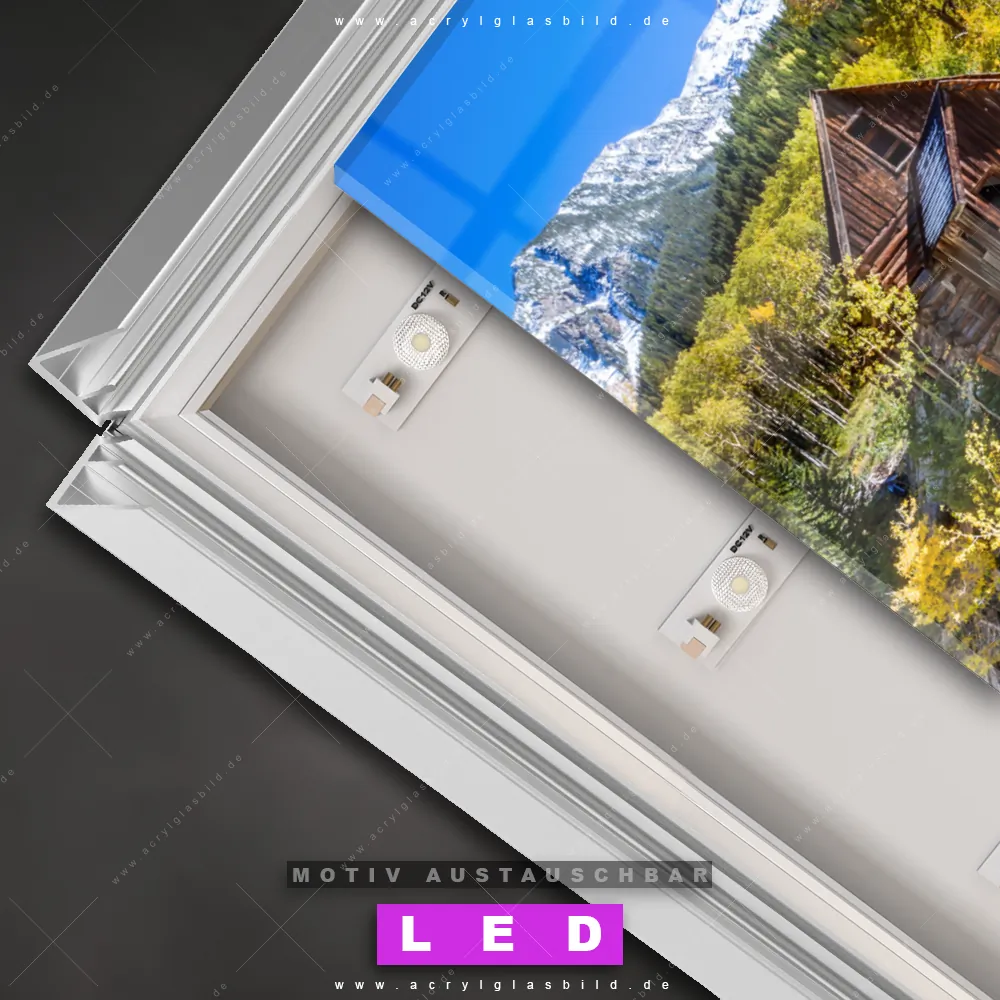 Du suchst nach einem Wandbild mit LED Beleuchtung als ultimativen Hingucker für deine Wände? Dann haben wir das perfekte dimmbare LED Bild mit Fernbedienung und optionaler Farbtemperatursteuerung für dich: unser abgefahrenes Architektur - Gebäude, Landschaften Canvalight® DIA LED Acrylglasbild! Mit dem LED Leuchtbild aus Acrylglas Waldhütte am Fluss im Hochformat mit austauschbarer bedruckter Acrylglas-Scheibe bringst du nicht nur Licht, sondern auch ordentlich Stil in deine Bude.