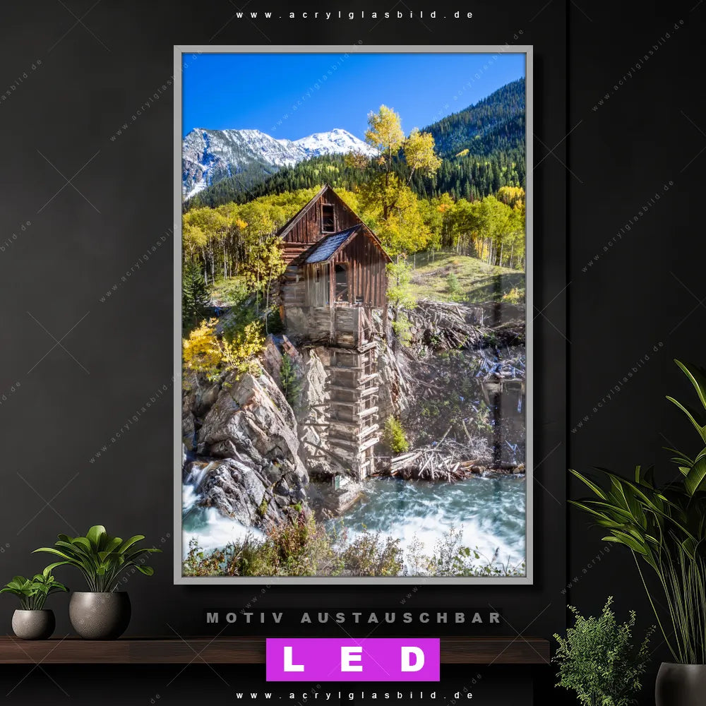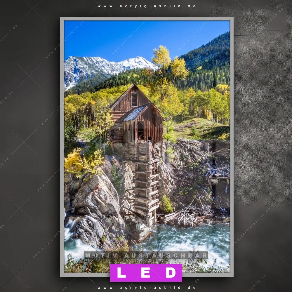 Wer braucht schon langweilige Wände, wenn man sie mit unserem LED Acrylglasbild Canvalight® DIA Cristall Mill in Amerika aufpeppen kann? Dank der genialen LED-Ausleuchtung wirst du in Arzt - Praxis, Büro - Kanzlei, Flur - Eingangsbereich, Wohnzimmer - Schlafzimmer nie wieder über deine eigenen Füße stolpern. Wenn du nach einem beleuchteten Wandbild aus Acrylglas mit Sehenswürdigkeit, USA, Fluss, Landschaft, Wald, Berge, Bäume, Felsen, Herbst suchst, dann ist unser LED Acrylglasbild historische Waldhütte in Colorado in den hammermäßigen Motiv-Farben Weiss, Blau, Braun, Beige, Grün, Hellgrün, Hellblau, Orange, Türkis genau das richtige LED Bild für dich. Im coolen Natürlich - Realistisch Stil gestaltet, passt das LED Leuchtbild mit DIA-Klapprahmen und glänzender Front aus Acrylglas perfekt zu jedem Einrichtungsstil – sogar zu deinem chaotischen Kreativlabor!