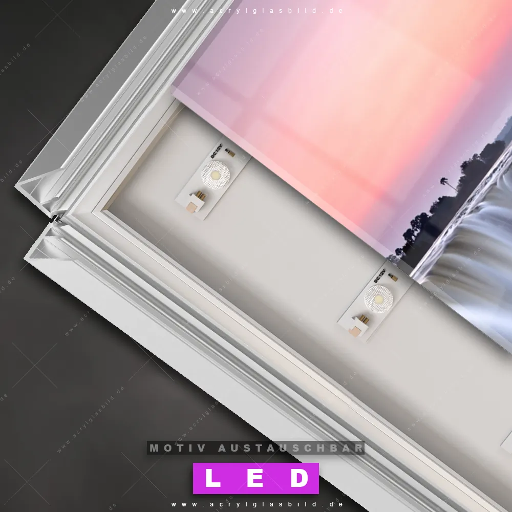 Du suchst nach einem Wandbild mit LED Beleuchtung als ultimativen Hingucker für deine Wände? Dann haben wir das perfekte dimmbare LED Bild mit Fernbedienung und optionaler Farbtemperatursteuerung für dich: unser abgefahrenes Landschaften Canvalight® DIA LED Acrylglasbild! Mit dem LED Leuchtbild aus Acrylglas Wasserfall bei Abendröte im Hochformat mit austauschbarer bedruckter Acrylglas-Scheibe bringst du nicht nur Licht, sondern auch ordentlich Stil in deine Bude.