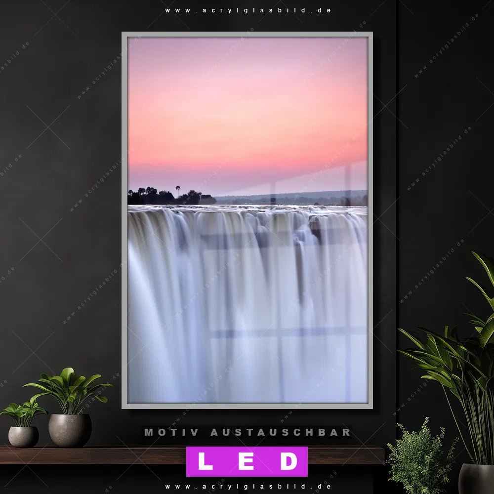 Wer braucht schon langweilige Wände, wenn man sie mit unserem LED Acrylglasbild Canvalight® DIA Viktoriafälle aufpeppen kann? Dank der genialen LED-Ausleuchtung wirst du in Wohnzimmer - Schlafzimmer, Küche - Esszimmer, Friseur - Beauty, Büro - Kanzlei, Bar - Gastronomie, Arzt - Praxis, Badezimmer nie wieder über deine eigenen Füße stolpern. Wenn du nach einem beleuchteten Wandbild aus Acrylglas mit Sehenswürdigkeit, Afrika, Wasserfall, Landschaft, Natur suchst, dann ist unser LED Acrylglasbild Wasserfall bei Sonnenuntergang in den hammermäßigen Motiv-Farben Lila, Weiss, Rot, Rosa, Schwarz genau das richtige LED Bild für dich. Im coolen Natürlich - Realistisch Stil gestaltet, passt das LED Leuchtbild mit DIA-Klapprahmen und glänzender Front aus Acrylglas perfekt zu jedem Einrichtungsstil – sogar zu deinem chaotischen Kreativlabor!