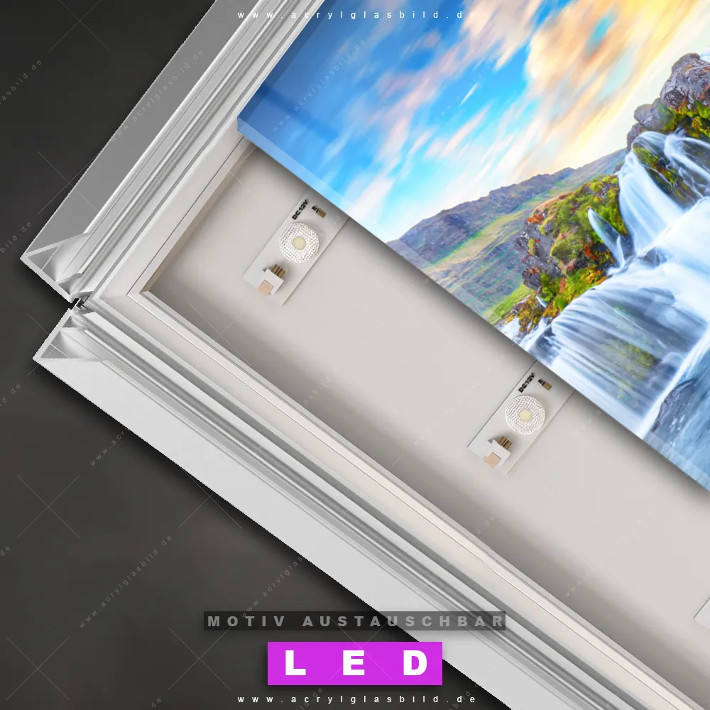 Du suchst nach einem Wandbild mit LED Beleuchtung als ultimativen Hingucker für deine Wände? Dann haben wir das perfekte dimmbare LED Bild mit Fernbedienung und optionaler Farbtemperatursteuerung für dich: unser abgefahrenes Landschaften Canvalight® DIA LED Acrylglasbild! Mit dem LED Leuchtbild aus Acrylglas Wasserfall bei Sonnenuntergang im Hochformat mit austauschbarer bedruckter Acrylglas-Scheibe bringst du nicht nur Licht, sondern auch ordentlich Stil in deine Bude.