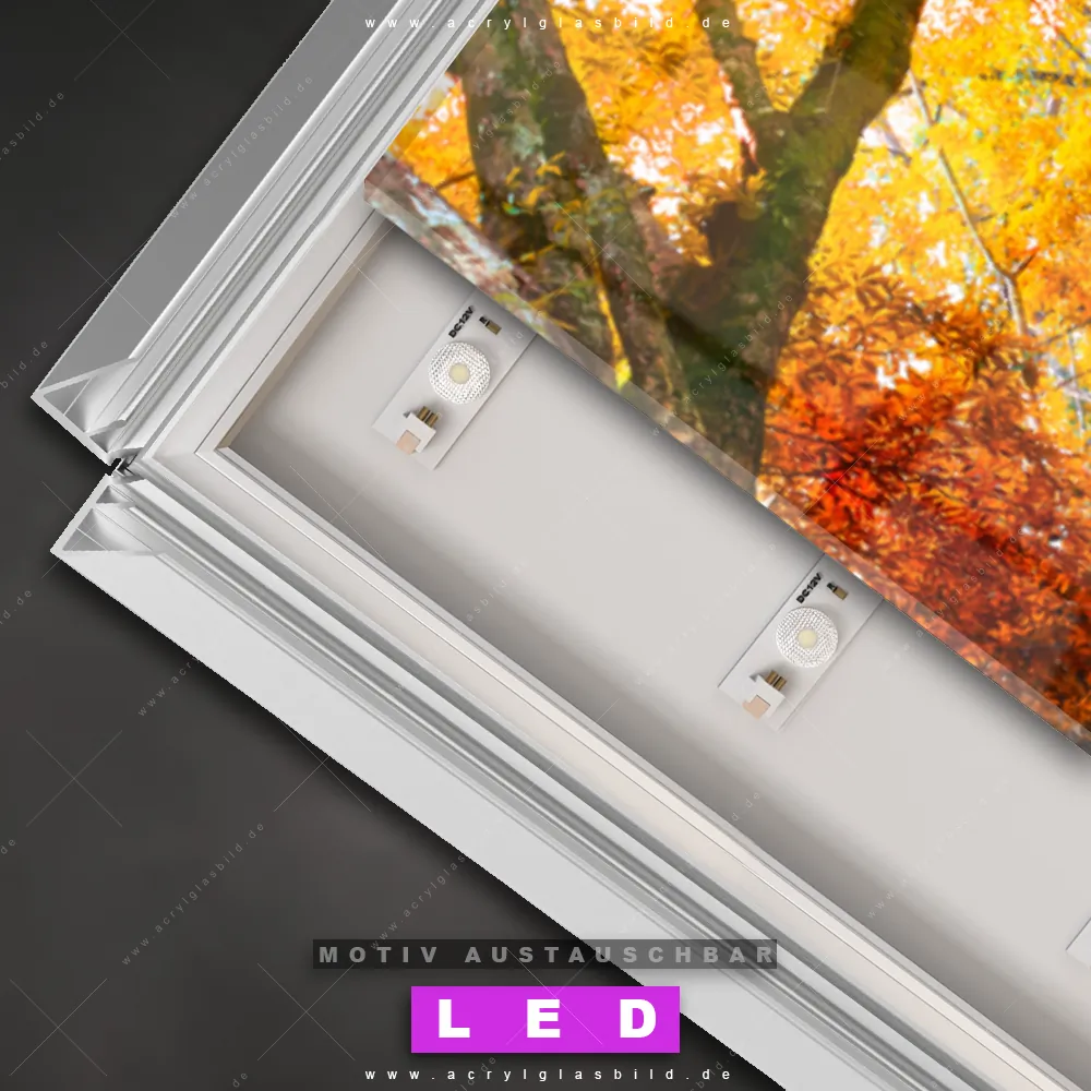 Bist du bereit, deine Wände mit einem dimmbaren LED Bild mit Fernbedienung und optionaler Farbtemperatursteuerung auf das nächste Level zu bringen? Unser Landschaften, Wald - Bäume Canvalight® DIA LED Acrylglasbild ist genau das, was du brauchst! Das Wandbild mit LED Beleuchtung im Schmalen Format mit austauschbarer bedruckter Acrylglas-Scheibe Wasserfall im Wald bringt Licht und Stil in dein Zuhause – und das in null Komma nichts!