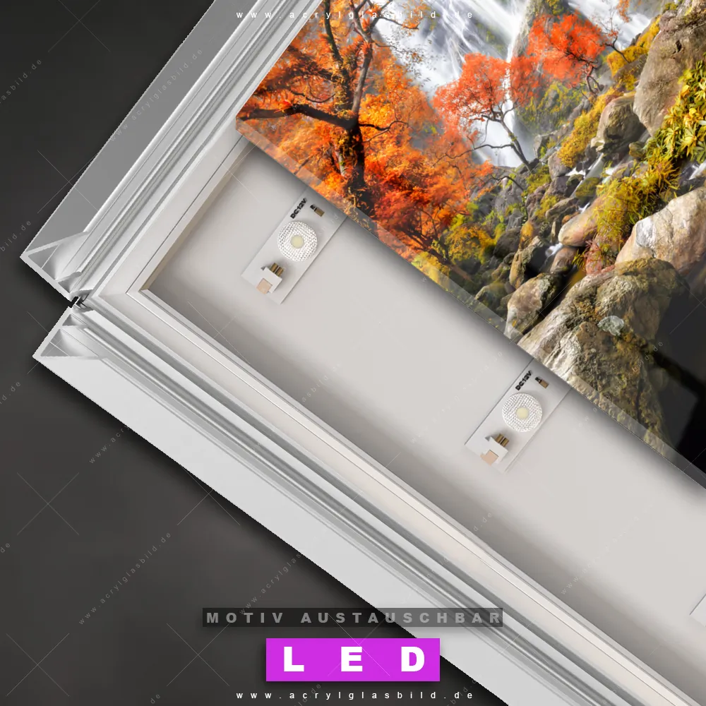 Also, worauf wartest du noch? Gib mit einem beleuchteten Wandbild mit wechselbarer Acrylglas-Scheibe deinen Wänden das gewisse Etwas und bestelle jetzt das LED Acrylglasbild Canvalight® DIA Wasserfall in hohen Bergen mit Laubwald – dein Zuhause wird es dir danken und deine Freunde werden dank der wechselbaren Motive erblassen!