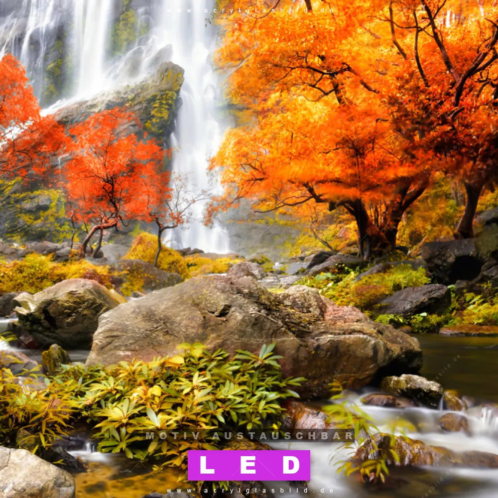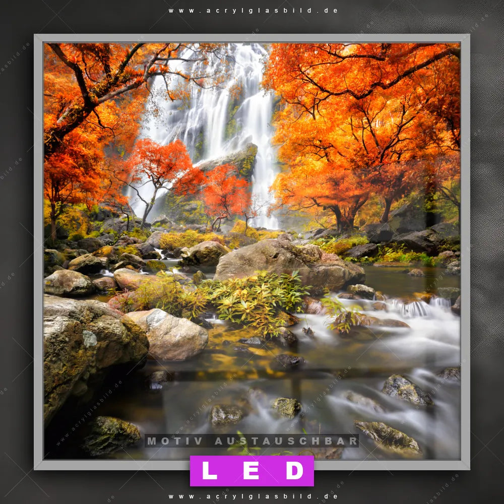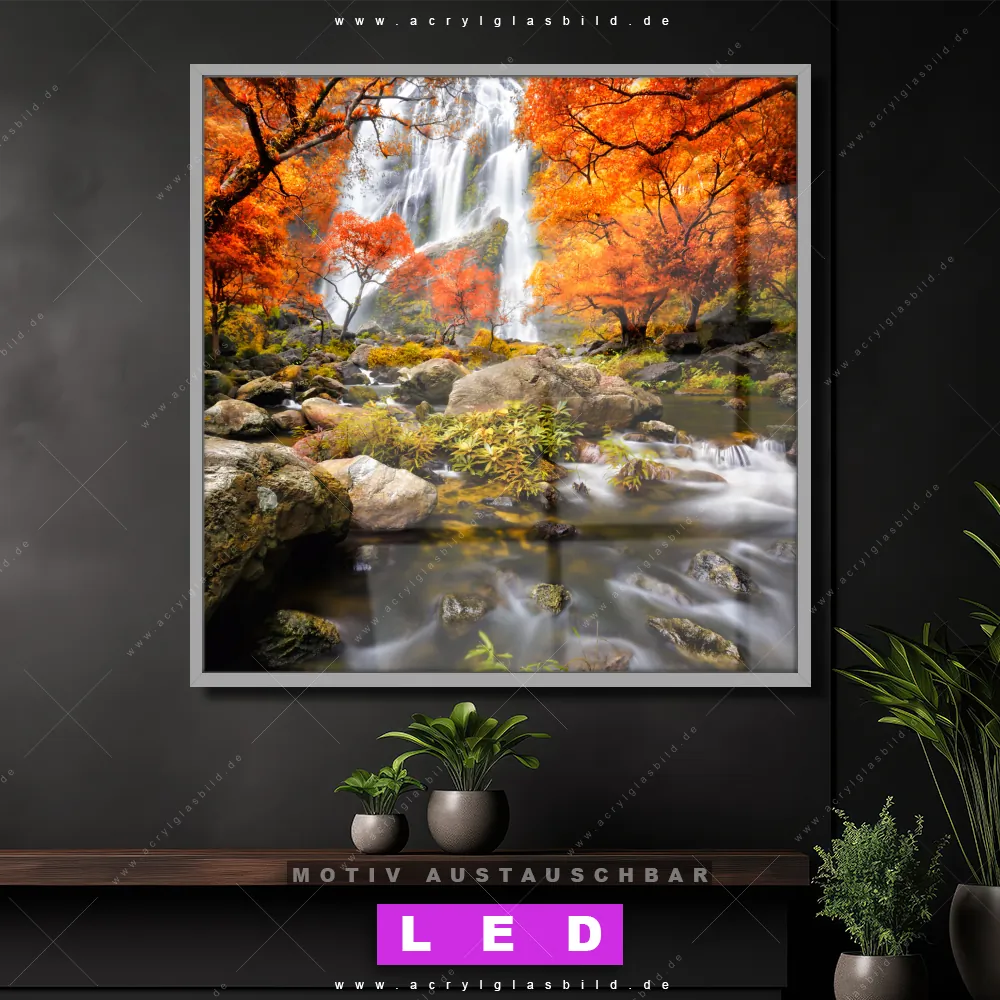 Bist du bereit, deine Wände mit einem dimmbaren LED Bild mit Fernbedienung und optionaler Farbtemperatursteuerung zum Leuchten zu bringen? Wir haben das ultimative Landschaften LED Acrylglasbild Canvalight® DIA für dich! Unser LED Wandbild aus Acrylglas Wasserfall in Herbstlandschaft im Quadratischen Format mit austauschbarer bedruckter Acrylglas-Scheibe im DIA-Klapprahmen bringt sofort jede Menge Glanz in deine vier Wände.
