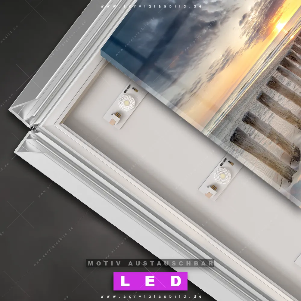 Also, worauf wartest du noch? Gib mit einem beleuchteten Wandbild mit wechselbarer Acrylglas-Scheibe deinen Wänden das gewisse Etwas und bestelle jetzt das LED Acrylglasbild Canvalight® DIA Holzpfosten am Strand – dein Zuhause wird es dir danken und deine Freunde werden dank der wechselbaren Motive erblassen!