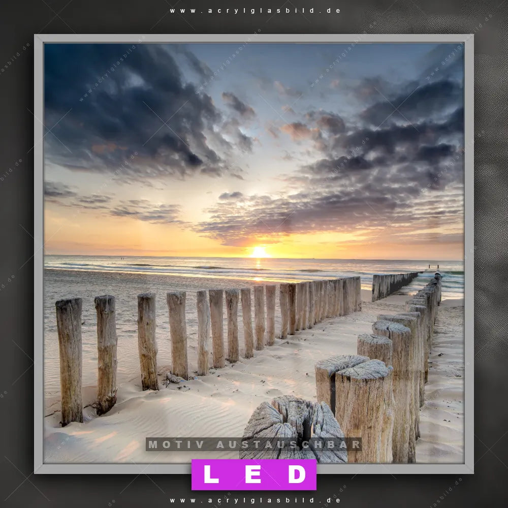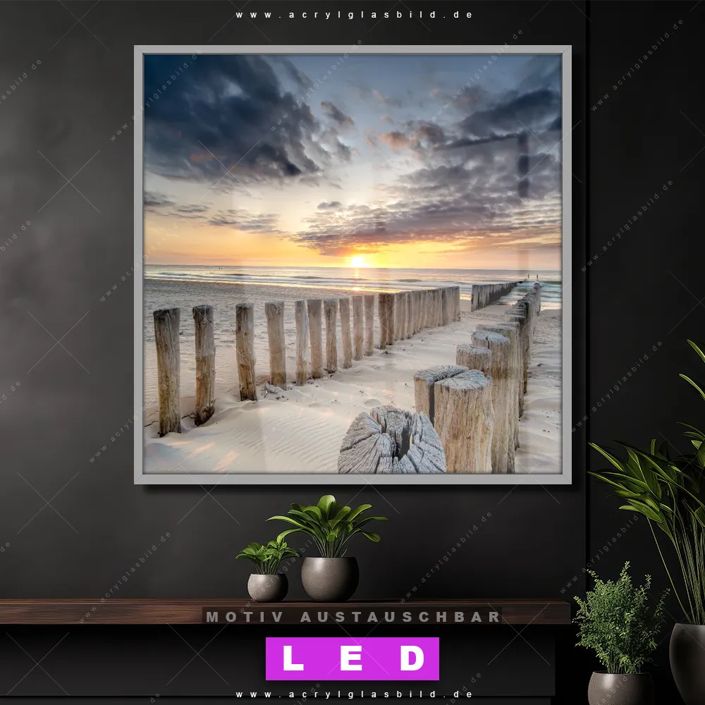 Bist du bereit, deine Wände mit einem dimmbaren LED Bild mit Fernbedienung und optionaler Farbtemperatursteuerung zum Leuchten zu bringen? Wir haben das ultimative Strand - Meer, Landschaften LED Acrylglasbild Canvalight® DIA für dich! Unser LED Wandbild aus Acrylglas Wellenbrecher am Nordseestrand im Quadratischen Format mit austauschbarer bedruckter Acrylglas-Scheibe im DIA-Klapprahmen bringt sofort jede Menge Glanz in deine vier Wände.