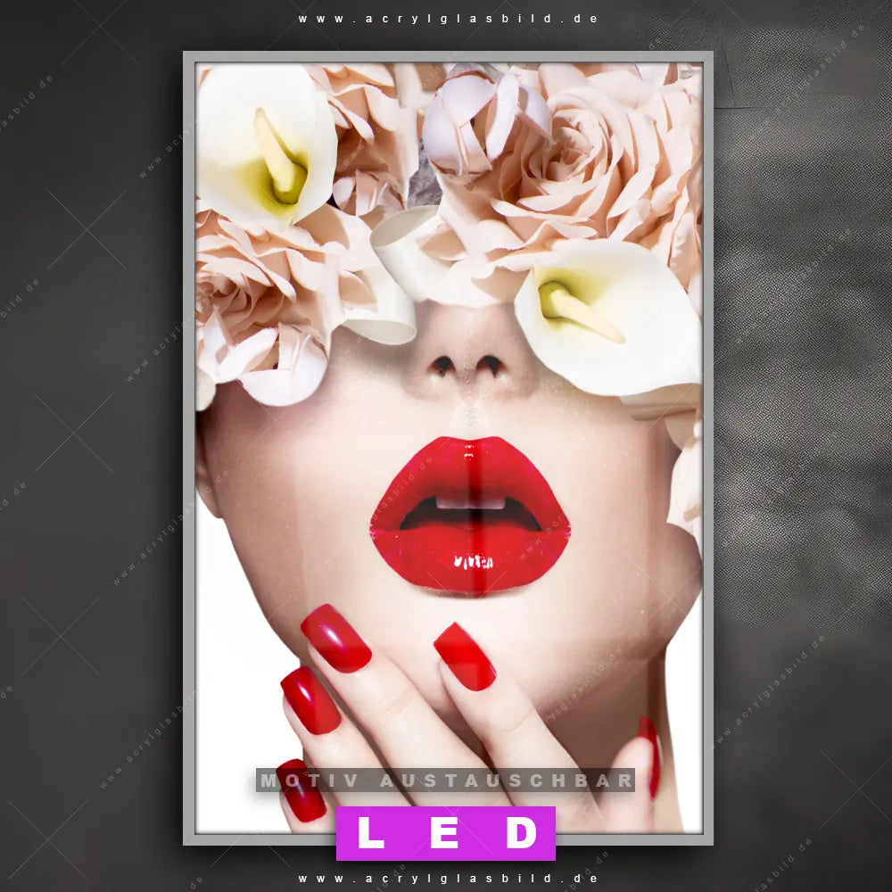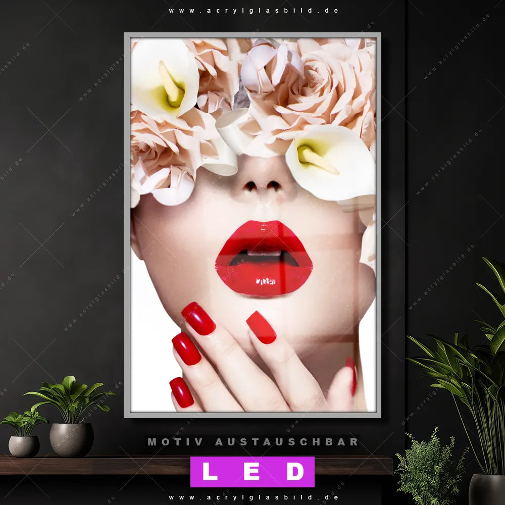 Wer braucht schon langweilige Wände, wenn man sie mit unserem LED Acrylglasbild Canvalight® DIA verführerische Lippen aufpeppen kann? Dank der genialen LED-Ausleuchtung wirst du in Bar - Gastronomie, Friseur - Beauty, Wohnzimmer - Schlafzimmer nie wieder über deine eigenen Füße stolpern. Wenn du nach einem beleuchteten Wandbild aus Acrylglas mit Menschen & Blumen, Frau, Porträt, modern, Beauty, Gesicht, Blumen, Blüten, Schönheit, Mode, Lippen suchst, dann ist unser LED Acrylglasbild rote Lippen in den hammermäßigen Motiv-Farben Beige, Weiss, Rot genau das richtige LED Bild für dich. Im coolen Modern Art, Floral Stil gestaltet, passt das LED Leuchtbild mit DIA-Klapprahmen und glänzender Front aus Acrylglas perfekt zu jedem Einrichtungsstil – sogar zu deinem chaotischen Kreativlabor!