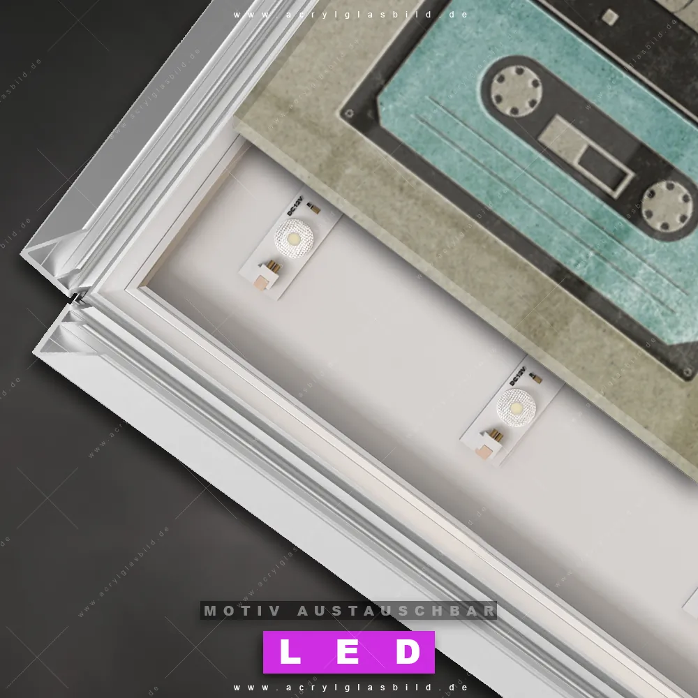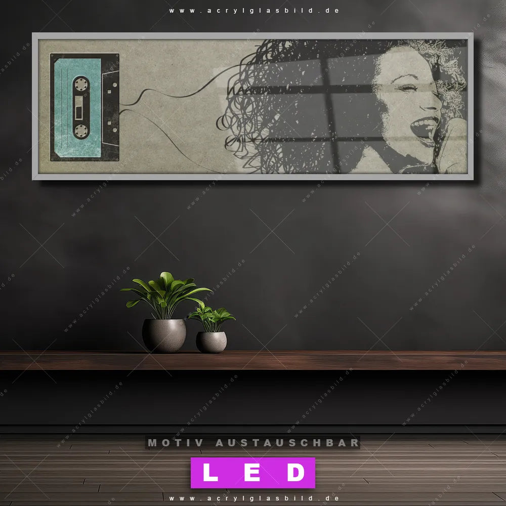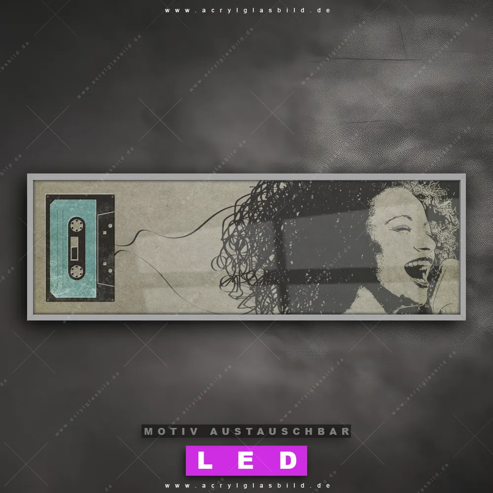 Deine Wände könnten dringend ein dimmbares LED Bild mit Fernbedienung und optionaler Farbtemperatursteuerung gebrauchen? Dann haben wir das perfekte Wandbild mit LED Beleuchtung für dich: unser mega-cooles Porträts - Menschen Canvalight® DIA LED Acrylglasbild! Mit unserem angesagten Leuchtbild aus Acrylglas im Panorama-Format und der austauschbaren bedruckten Acrylglas-Scheibe Kassette & Sängerin bringst du nicht nur Licht, sondern auch jede Menge Flair in deine Räume.