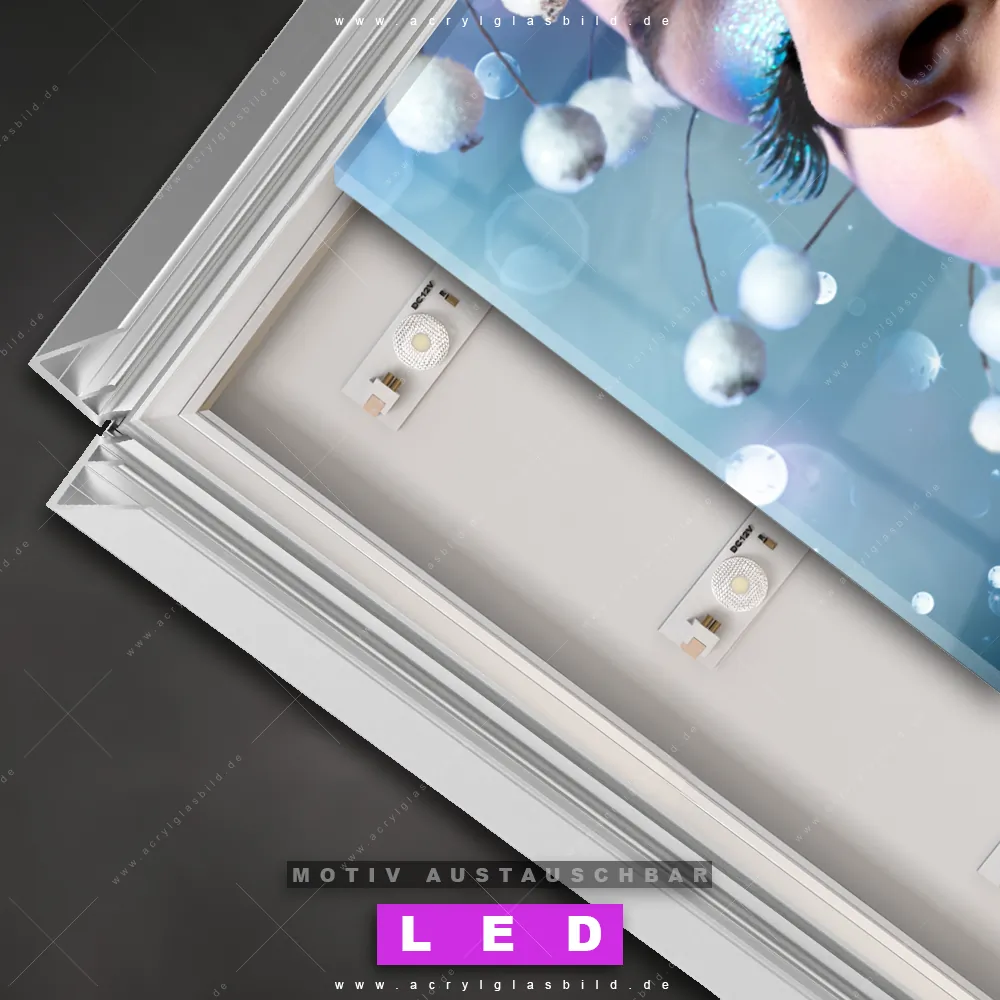 Also, worauf wartest du noch? Gib mit einem beleuchteten Wandbild mit wechselbarer Acrylglas-Scheibe deinen Wänden das gewisse Etwas und bestelle jetzt das LED Acrylglasbild Canvalight® DIA anmutige, kühle Frau – dein Zuhause wird es dir danken und deine Freunde werden dank der wechselbaren Motive erblassen!
