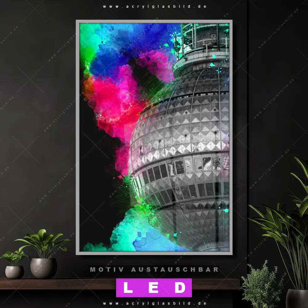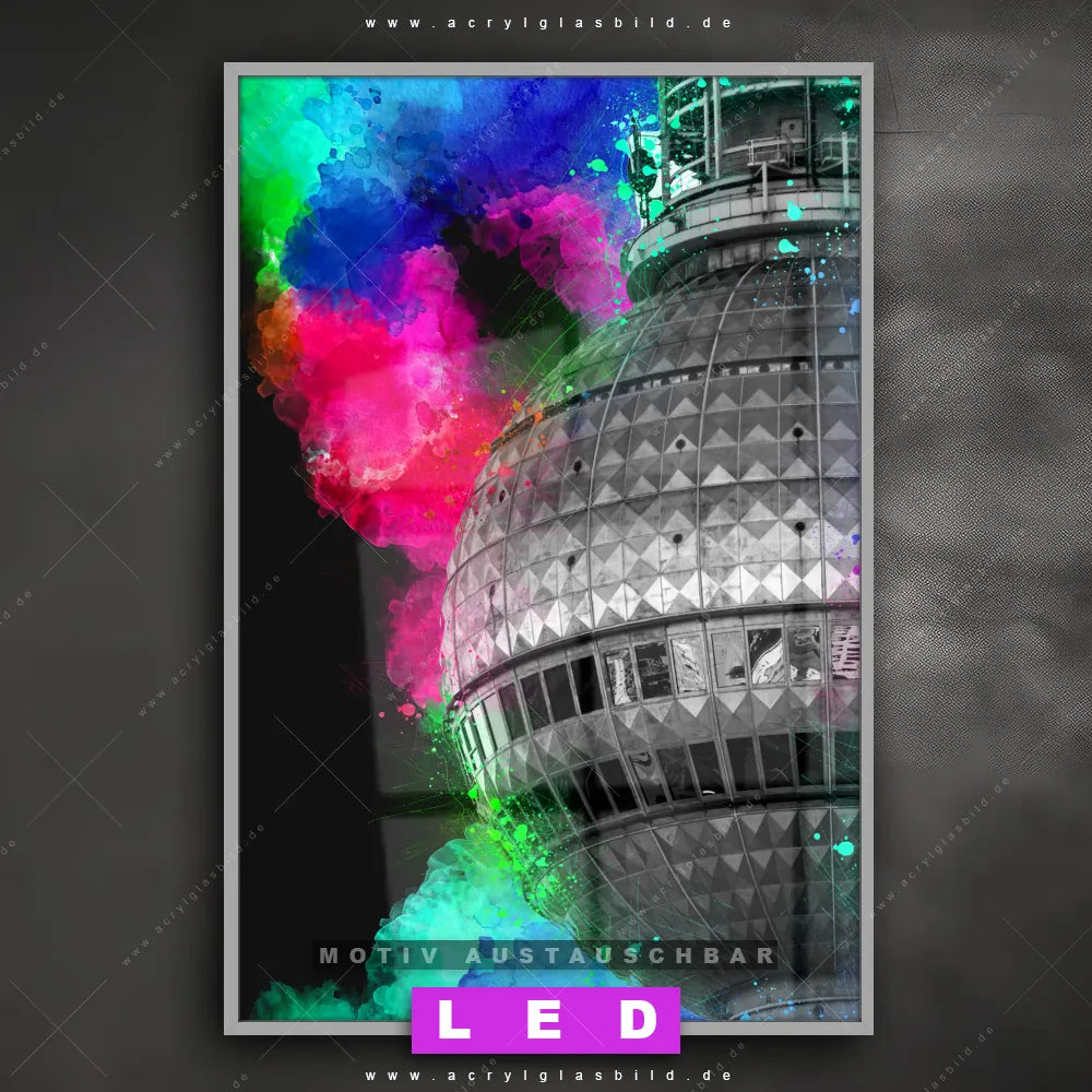 Wer braucht schon langweilige Wände, wenn man sie mit unserem LED Acrylglasbild Canvalight® DIA Berliner Fernsehturm in Aquarwllnebel aufpeppen kann? Dank der genialen LED-Ausleuchtung wirst du in Arzt - Praxis, Bar - Gastronomie, Büro - Kanzlei, Flur - Eingangsbereich, Wohnzimmer - Schlafzimmer nie wieder über deine eigenen Füße stolpern. Wenn du nach einem beleuchteten Wandbild aus Acrylglas mit Pop Art, Kunst, bunt, Deutschland, Sehenswürdigkeit, Berlin, Fernsehturm, Farbspritzer suchst, dann ist unser LED Acrylglasbild Farbexplosion am Wahrzeichen Berlins in den hammermäßigen Motiv-Farben Bunt, Grau , Türkis, Lila, Pink, Rosa, Rot, Hellgrün, Hellblau, Grün, Weiss genau das richtige LED Bild für dich. Im coolen Grunge, Mixed Media, Modern Art Stil gestaltet, passt das LED Leuchtbild mit DIA-Klapprahmen und glänzender Front aus Acrylglas perfekt zu jedem Einrichtungsstil – sogar zu deinem chaotischen Kreativlabor!