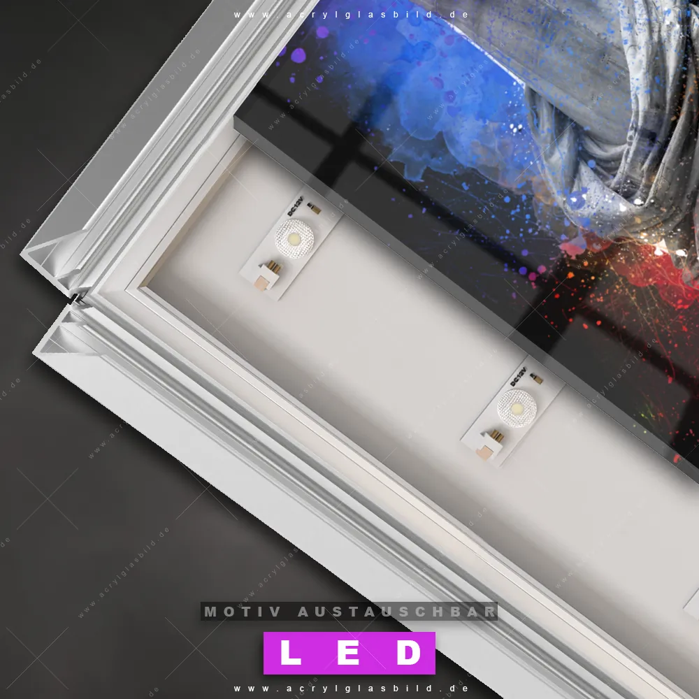 Mit unserem LED Acrylglasbild Canvalight® DIA Freiheitsstatue im Farbnebel und seiner genialen LED-Ausleuchtung wirst du nie wieder im Dunkeln auf deinem Sofa herumtappen. Wenn du nach einem beleuchteten Wandbild aus Acrylglas mit Freiheitsstatue, Statue of Liberty, Pop Art, Kunst, bunt, Amerika, USA, Kultur für Arzt - Praxis, Bar - Gastronomie, Büro - Kanzlei, Flur - Eingangsbereich, Wohnzimmer - Schlafzimmer suchst, ist unser LED Leuchtbild Freiheitsstatue in einem Strudel von Farben in den beeindruckenden Motiv-Farben Bunt, Schwarz, Blau, Gelb , Grün, Lila, Rot genau das richtige beleuchtete Wandbild für dich. Gestaltet im Modern Art, Pop Art Stil, passt dieses LED Wandbild mit DIA-Klapprahmen und glänzender Front aus Acrylglas perfekt zu jedem Einrichtungsstil – sogar zu deinem chaotischen kreativen Durcheinander!