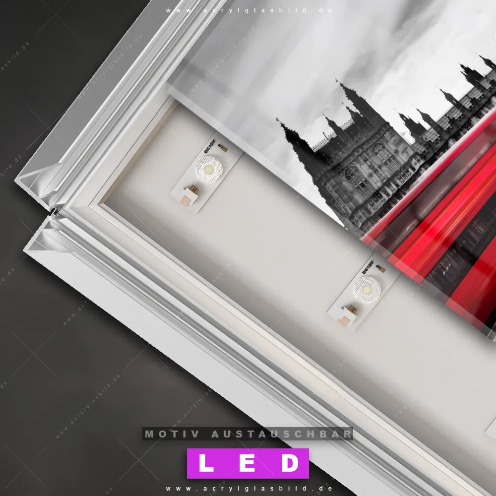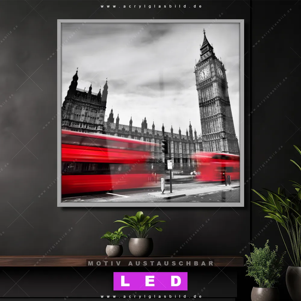 Also, worauf wartest du noch? Gib mit einem beleuchteten Wandbild mit wechselbarer Acrylglas-Scheibe deinen Wänden das gewisse Etwas und bestelle jetzt das LED Acrylglasbild Canvalight® DIA Busse vor Big Ben – dein Zuhause wird es dir danken und deine Freunde werden dank der wechselbaren Motive erblassen!
