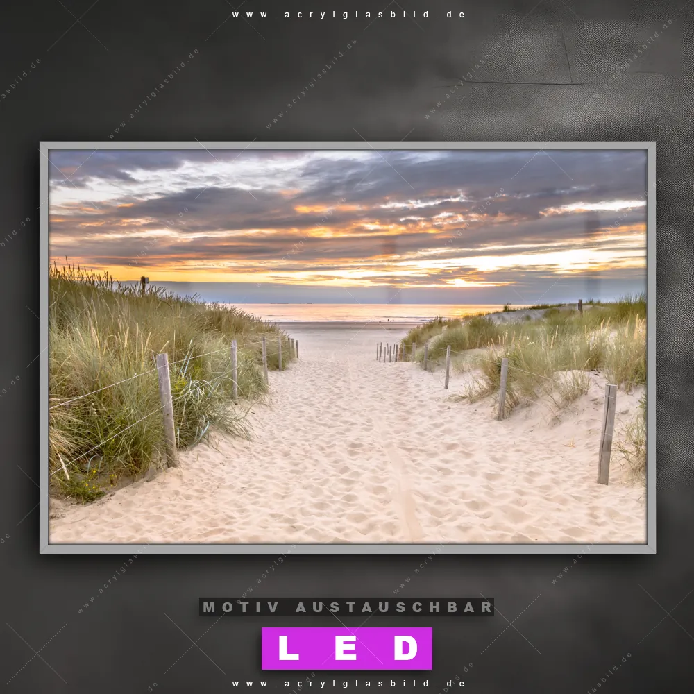 Mit unserem LED Acrylglasbild Canvalight® DIA Weg zum Strand mit Gräsern und seiner genialen LED-Ausleuchtung wirst du nie wieder im Dunkeln auf deinem Sofa herumtappen. Wenn du nach einem beleuchteten Wandbild aus Acrylglas mit Sommer, Deutschland, Dünen, Gräser, Sonnenuntergang - Sonnenaufgang, Ostsee - Nordsee, Urlaub - Reisen, Strandweg für Arzt - Praxis, Büro - Kanzlei, Wohnzimmer - Schlafzimmer suchst, ist unser LED Leuchtbild Sandstrand mit Gräsern auf den Dünen in den beeindruckenden Motiv-Farben Grün, Beige, Hellblau, Orange genau das richtige beleuchtete Wandbild für dich. Gestaltet im Natürlich - Realistisch Stil, passt dieses LED Wandbild mit DIA-Klapprahmen und glänzender Front aus Acrylglas perfekt zu jedem Einrichtungsstil – sogar zu deinem chaotischen kreativen Durcheinander!