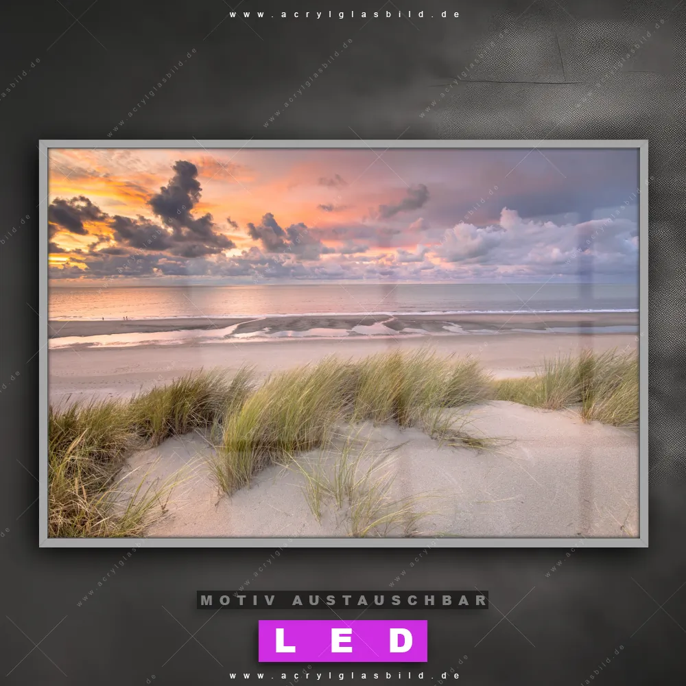 Begriffe wie Sommer, Deutschland, Dünen, Gräser, Ostsee - Nordsee, Urlaub - Reisen, Sonnenuntergang - Sonnenaufgang haben dich auf der Suche nach deinem neuen LED Wandbild aus Acrylglas inspiriert? Dann sollte das LED Acrylglasbild Sanddünen Deutschland den Weg zu dir finden.