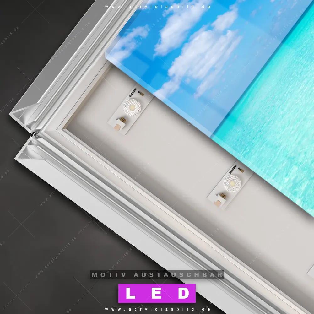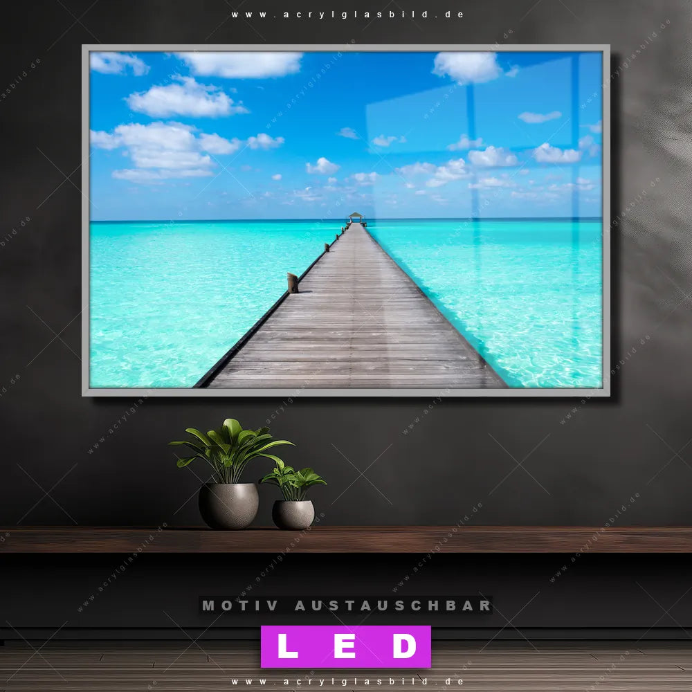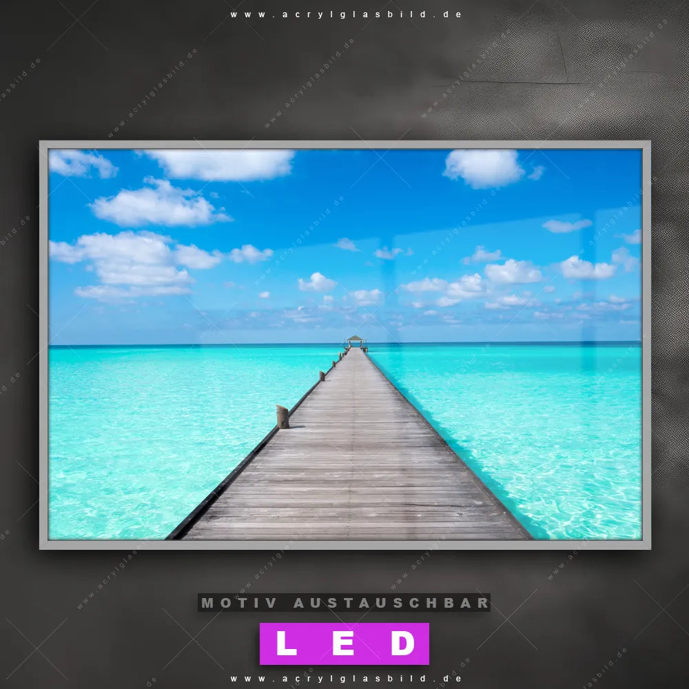 Du bist auf der Suche nach einem dimmbaren Strand - Meer, Landschaften LED Bild mit Fernbedienung und optionaler Farbtemperatursteuerung? Dann haben wir hier genau das richtige Wandbild mit LED Beleuchtung für dich: Unser Canvalight® DIA LED Acrylglasbild Hölzernes Pier im Querformat mit austauschbarer bedruckter Acrylglas-Scheibe. Dieses Leuchtbild bringt sofort Partybeleuchtung in deine Räume!