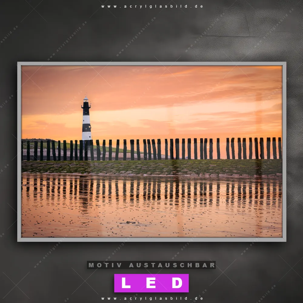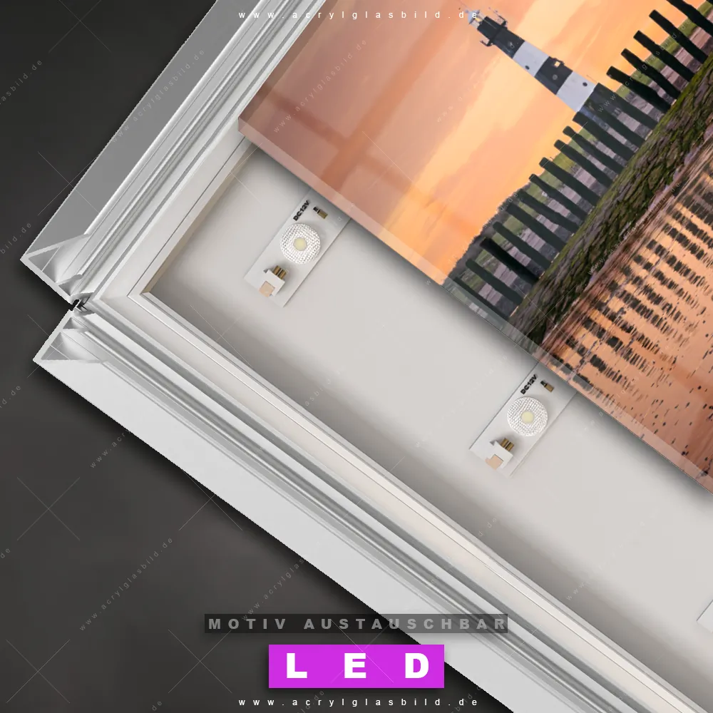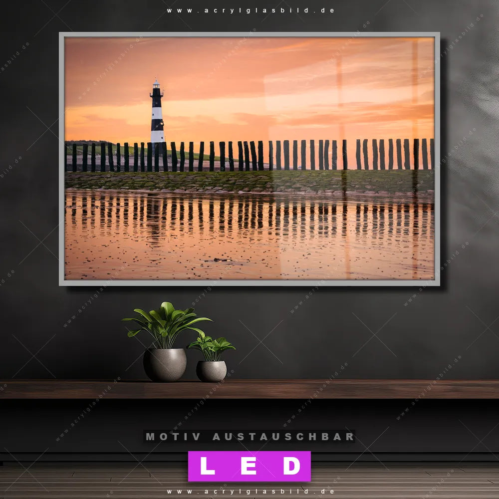 Du bist auf der Suche nach einem dimmbaren Landschaften, Strand - Meer LED Bild mit Fernbedienung und optionaler Farbtemperatursteuerung? Dann haben wir hier genau das richtige Wandbild mit LED Beleuchtung für dich: Unser Canvalight® DIA LED Acrylglasbild Leuchtturm bei Sonnenuntergang im Querformat mit austauschbarer bedruckter Acrylglas-Scheibe. Dieses Leuchtbild bringt sofort Partybeleuchtung in deine Räume!