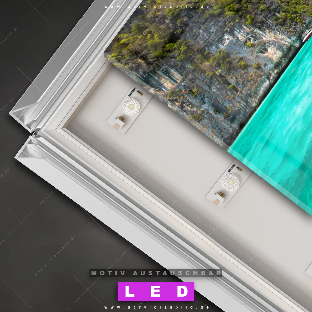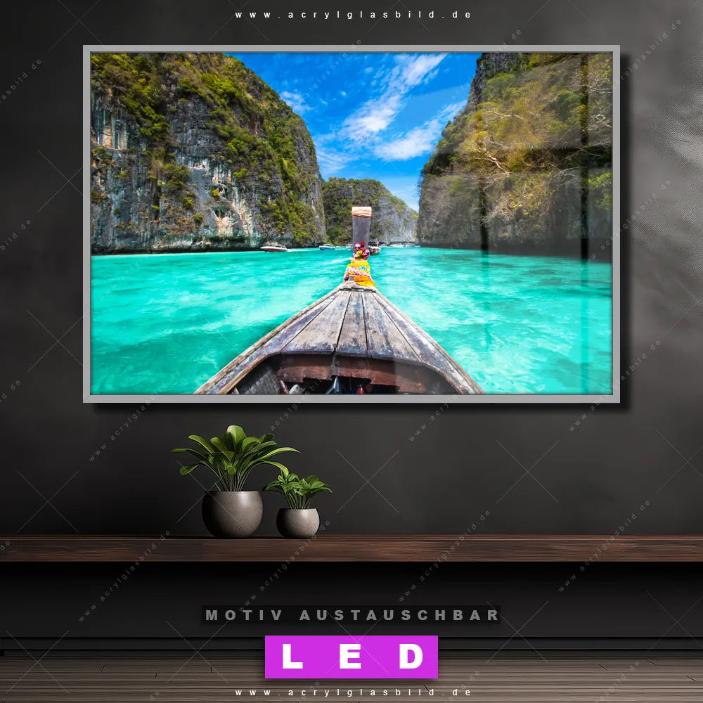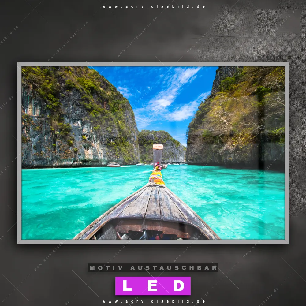 Du bist auf der Suche nach einem dimmbaren Landschaften, Strand - Meer LED Bild mit Fernbedienung und optionaler Farbtemperatursteuerung? Dann haben wir hier genau das richtige Wandbild mit LED Beleuchtung für dich: Unser Canvalight® DIA LED Acrylglasbild Longtail-Boot im Querformat mit austauschbarer bedruckter Acrylglas-Scheibe. Dieses Leuchtbild bringt sofort Partybeleuchtung in deine Räume!