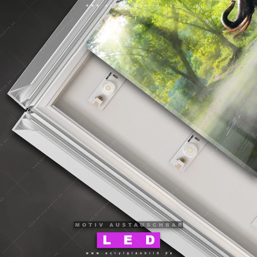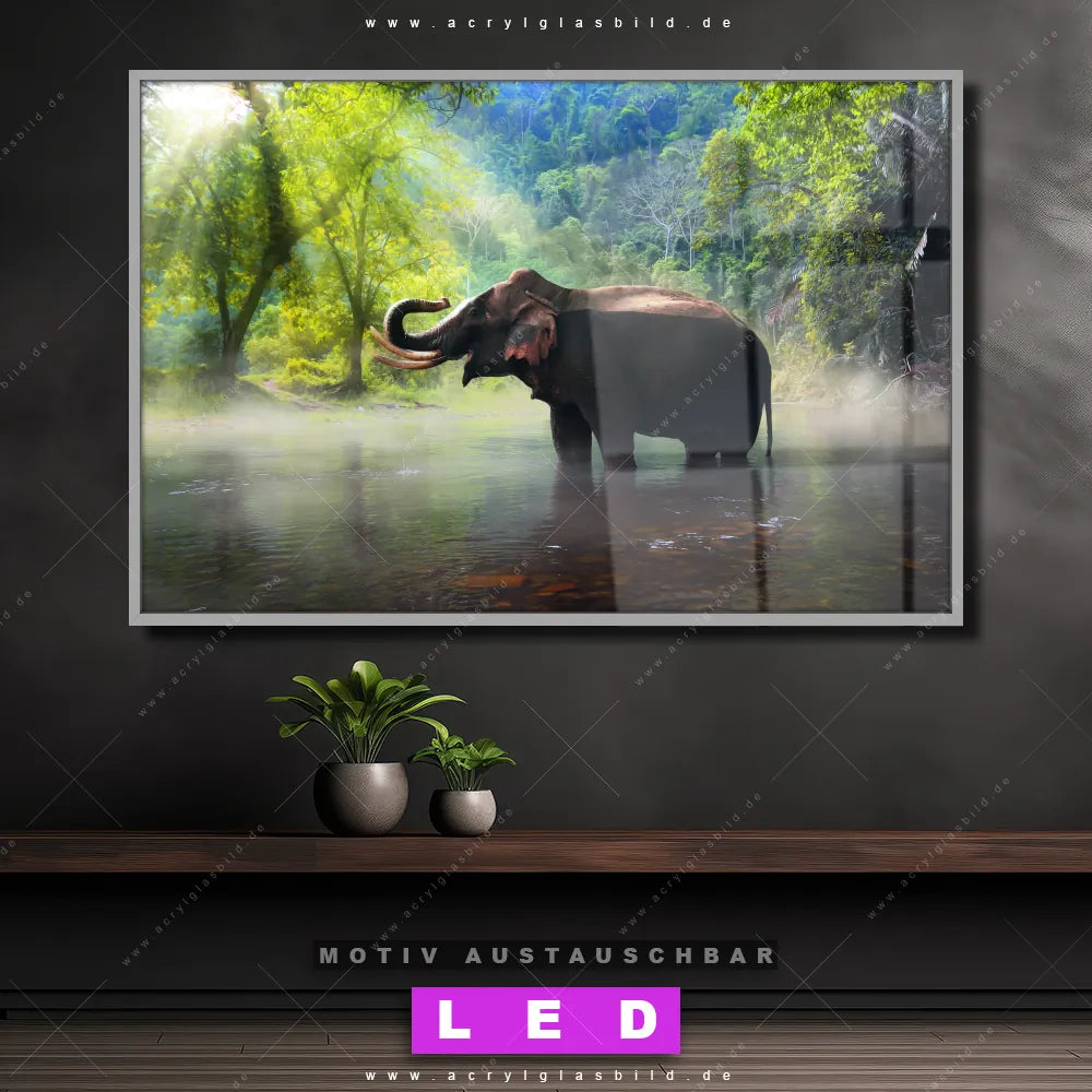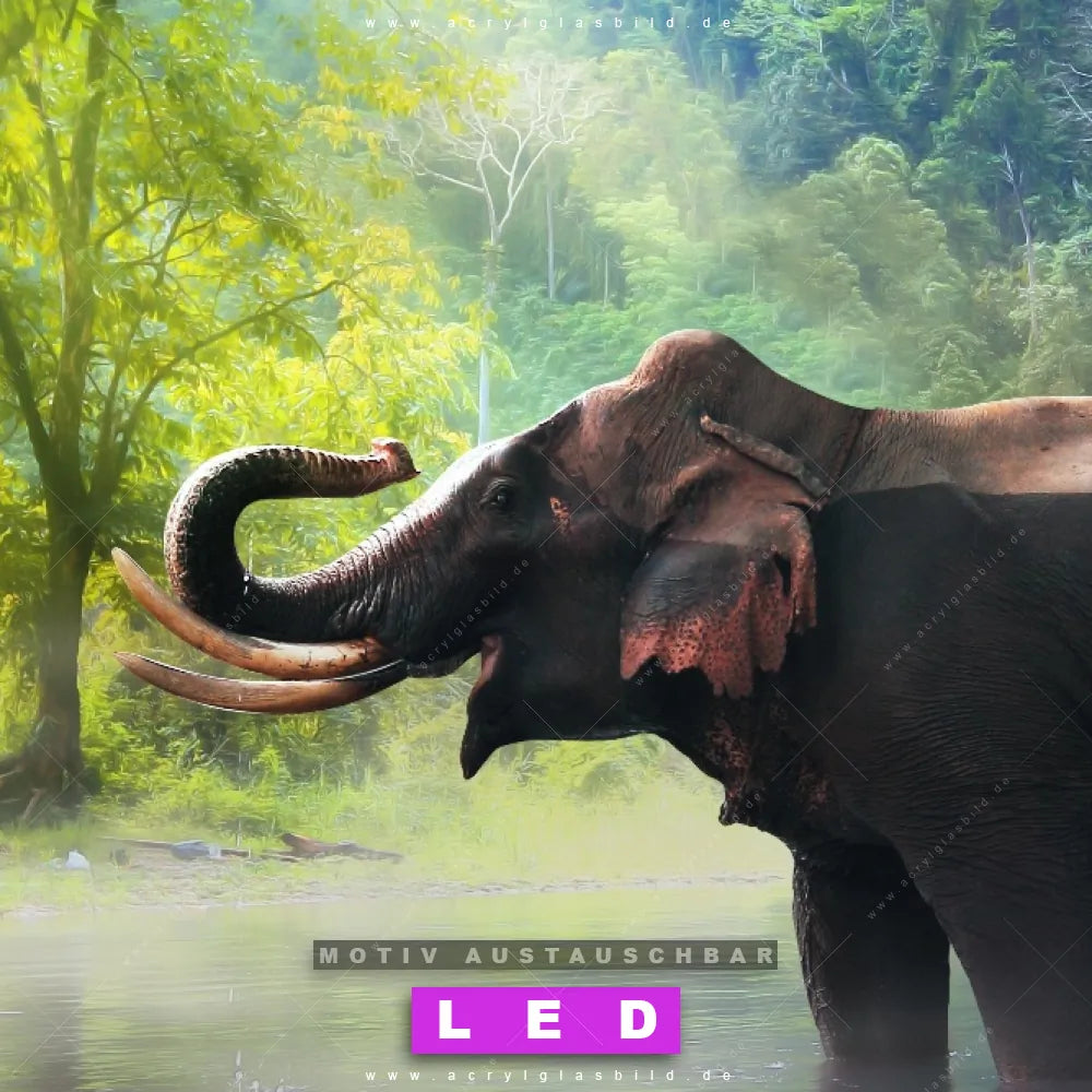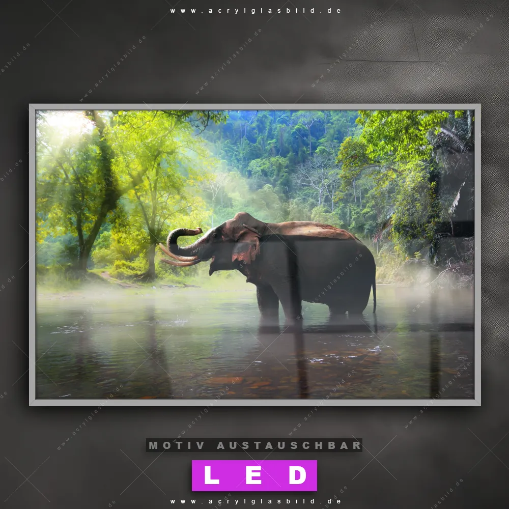Du bist auf der Suche nach einem dimmbaren Tierwelt LED Bild mit Fernbedienung und optionaler Farbtemperatursteuerung? Dann haben wir hier genau das richtige Wandbild mit LED Beleuchtung für dich: Unser Canvalight® DIA LED Acrylglasbild Elefant im Wasser im Querformat mit austauschbarer bedruckter Acrylglas-Scheibe. Dieses Leuchtbild bringt sofort Partybeleuchtung in deine Räume!