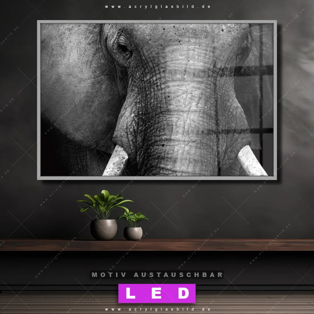 Mit unserem LED Acrylglasbild Canvalight® DIA Elefantenkopf und seiner genialen LED-Ausleuchtung wirst du nie wieder im Dunkeln auf deinem Sofa herumtappen. Wenn du nach einem beleuchteten Wandbild aus Acrylglas mit Afrika, wild, Safari, Tier, Elefant für Arzt - Praxis, Bar - Gastronomie, Büro - Kanzlei, Wohnzimmer - Schlafzimmer suchst, ist unser LED Leuchtbild Nahaufnahme Elefant in den beeindruckenden Motiv-Farben Weiss, Schwarz genau das richtige beleuchtete Wandbild für dich. Gestaltet im Natürlich - Realistisch, Schwarz - Weiss Stil, passt dieses LED Wandbild mit DIA-Klapprahmen und glänzender Front aus Acrylglas perfekt zu jedem Einrichtungsstil – sogar zu deinem chaotischen kreativen Durcheinander!