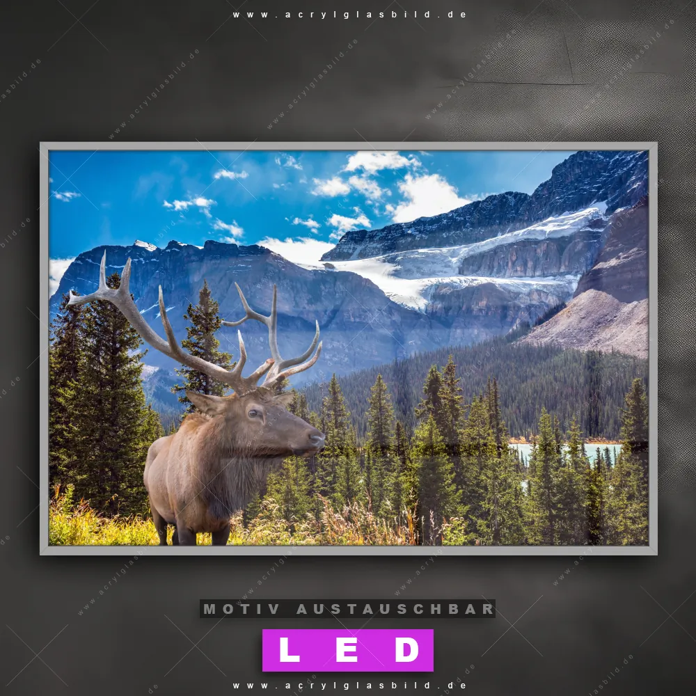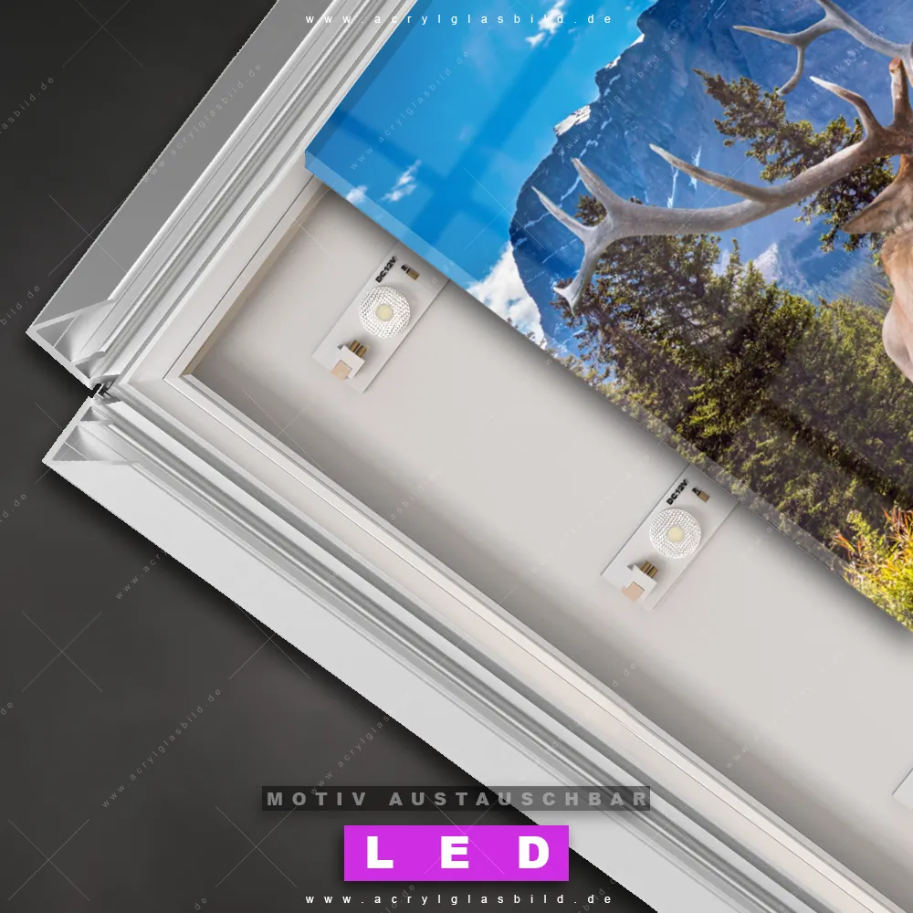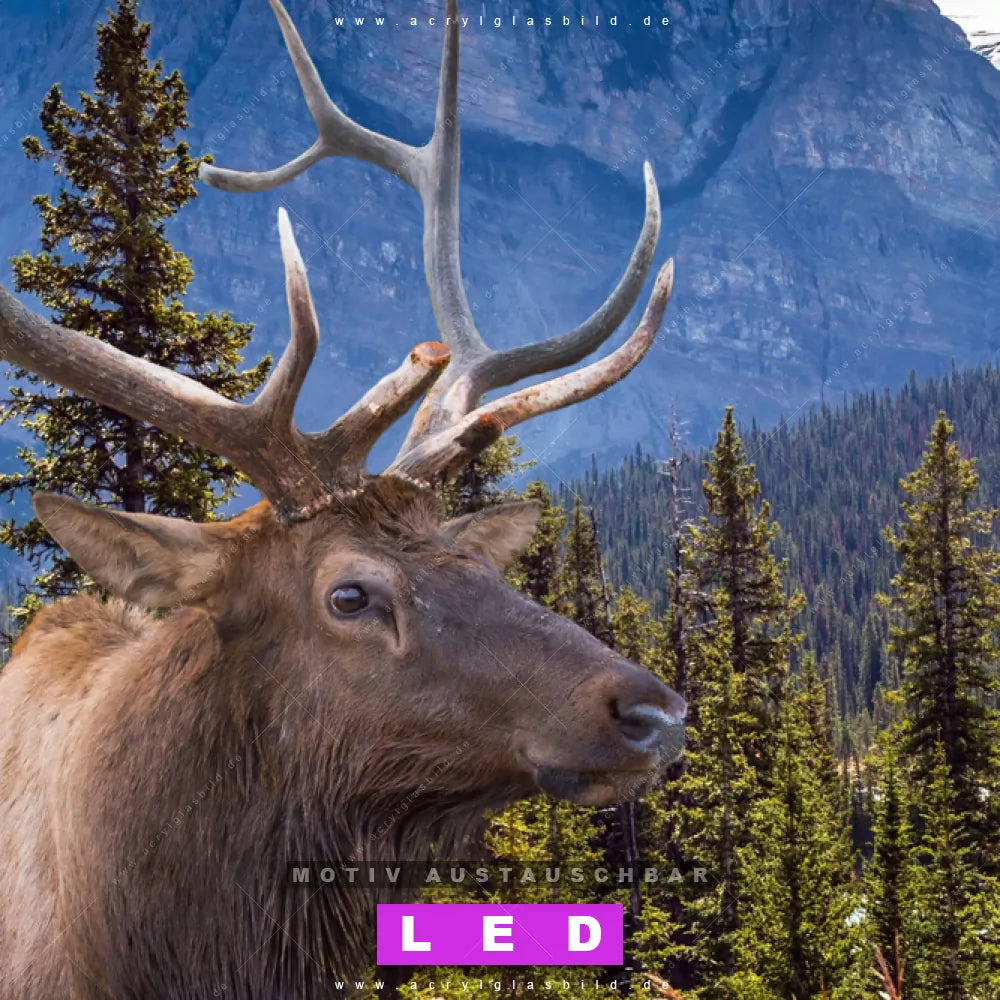 Du bist auf der Suche nach einem dimmbaren Landschaften, Tierwelt, Wald - Bäume LED Bild mit Fernbedienung und optionaler Farbtemperatursteuerung? Dann haben wir hier genau das richtige Wandbild mit LED Beleuchtung für dich: Unser Canvalight® DIA LED Acrylglasbild Hirsch vor Bergkulisse im Querformat mit austauschbarer bedruckter Acrylglas-Scheibe. Dieses Leuchtbild bringt sofort Partybeleuchtung in deine Räume!