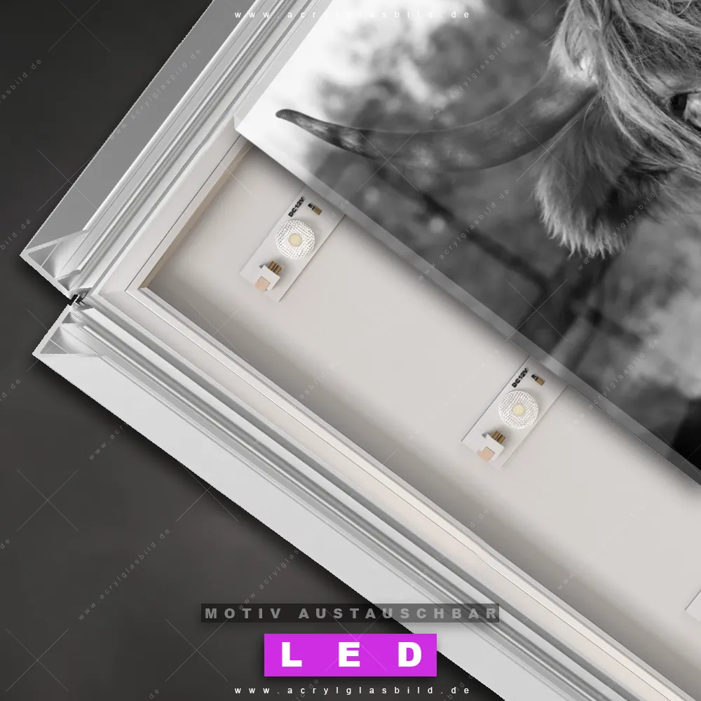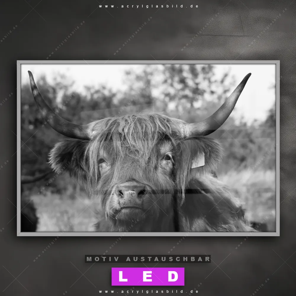 Du bist auf der Suche nach einem dimmbaren Tierwelt LED Bild mit Fernbedienung und optionaler Farbtemperatursteuerung? Dann haben wir hier genau das richtige Wandbild mit LED Beleuchtung für dich: Unser Canvalight® DIA LED Acrylglasbild Hochlandrind No.2 im Querformat mit austauschbarer bedruckter Acrylglas-Scheibe. Dieses Leuchtbild bringt sofort Partybeleuchtung in deine Räume!