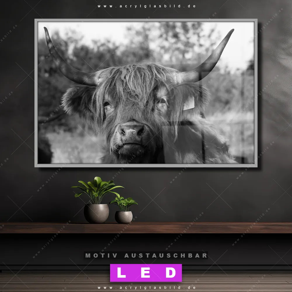 Mit unserem LED Acrylglasbild Canvalight® DIA Kopf Hochlandrind und seiner genialen LED-Ausleuchtung wirst du nie wieder im Dunkeln auf deinem Sofa herumtappen. Wenn du nach einem beleuchteten Wandbild aus Acrylglas mit Tier, Stier, Hochlandkuh, Highlander, Büffel, Rind, Bulle, Hochlandrind, Wiese, Weide, Hörner, Gras für Bar - Gastronomie, Wohnzimmer - Schlafzimmer suchst, ist unser LED Leuchtbild Hochlandrind schwarz-weiß in den beeindruckenden Motiv-Farben Weiss, Schwarz genau das richtige beleuchtete Wandbild für dich. Gestaltet im Modern Art, Natürlich - Realistisch, Schwarz - Weiss Stil, passt dieses LED Wandbild mit DIA-Klapprahmen und glänzender Front aus Acrylglas perfekt zu jedem Einrichtungsstil – sogar zu deinem chaotischen kreativen Durcheinander!
