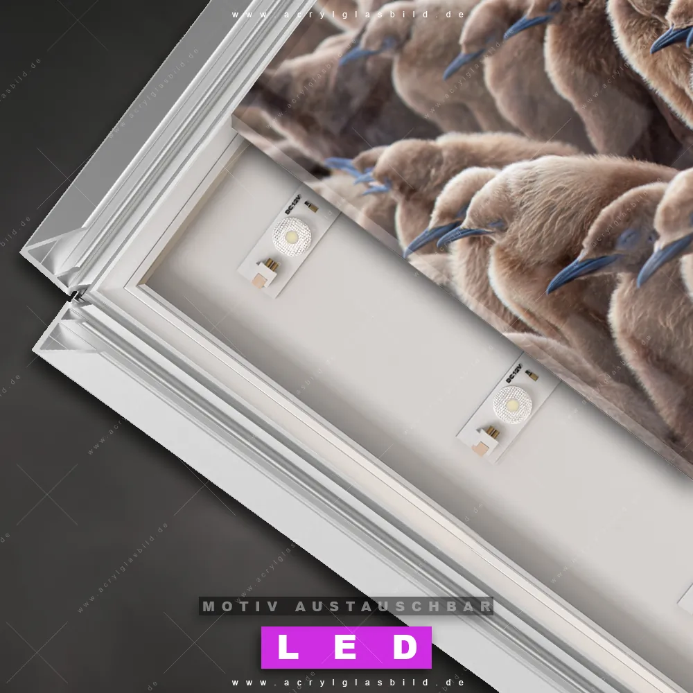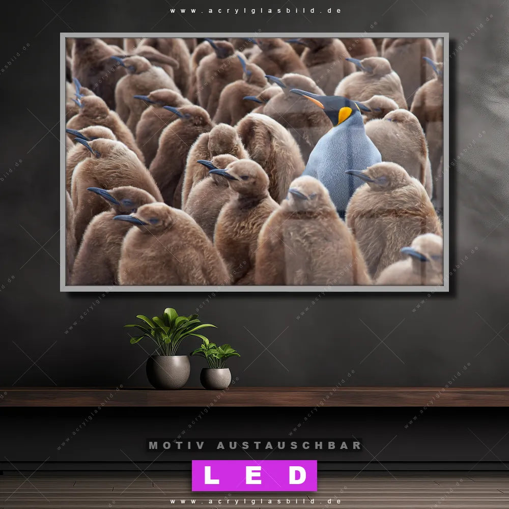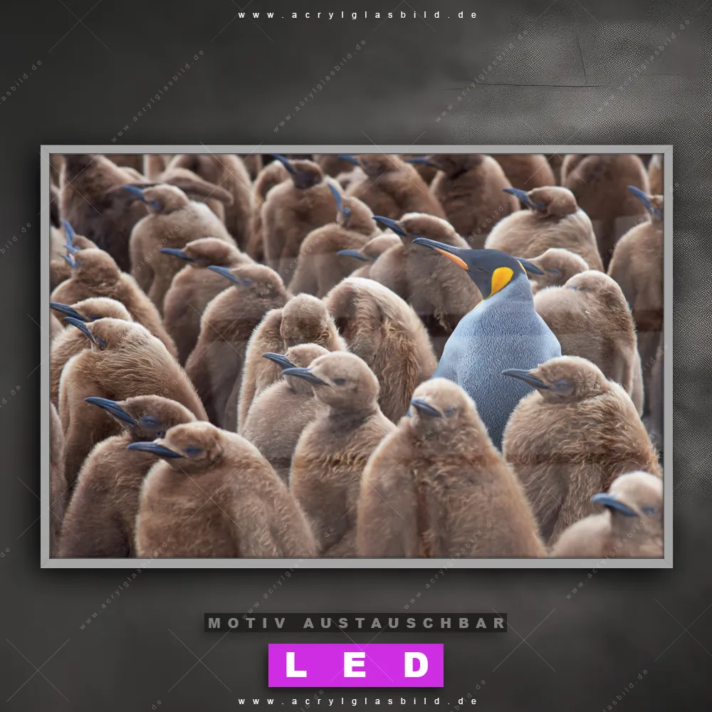 Du bist auf der Suche nach einem dimmbaren Tierwelt LED Bild mit Fernbedienung und optionaler Farbtemperatursteuerung? Dann haben wir hier genau das richtige Wandbild mit LED Beleuchtung für dich: Unser Canvalight® DIA LED Acrylglasbild Königspinguine im Querformat mit austauschbarer bedruckter Acrylglas-Scheibe. Dieses Leuchtbild bringt sofort Partybeleuchtung in deine Räume!