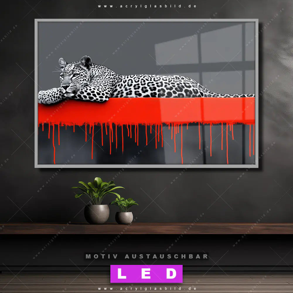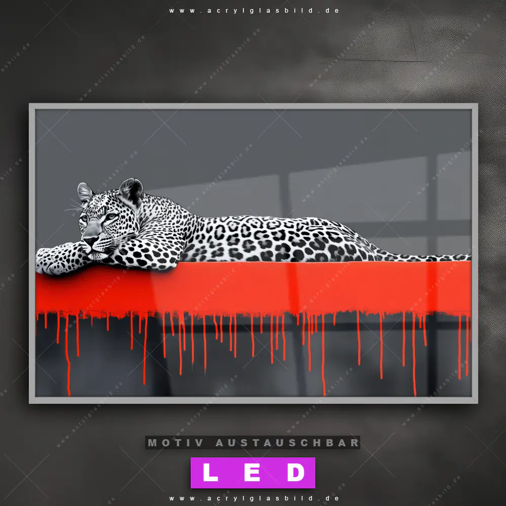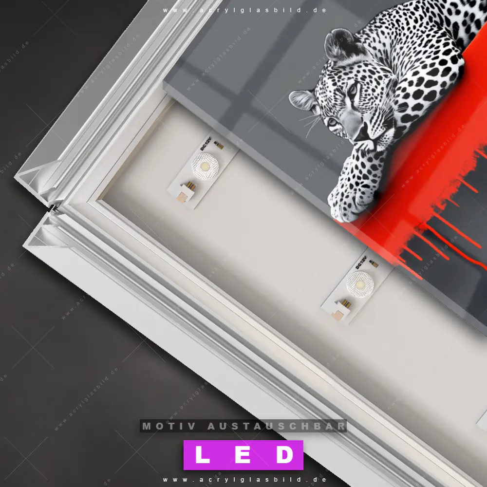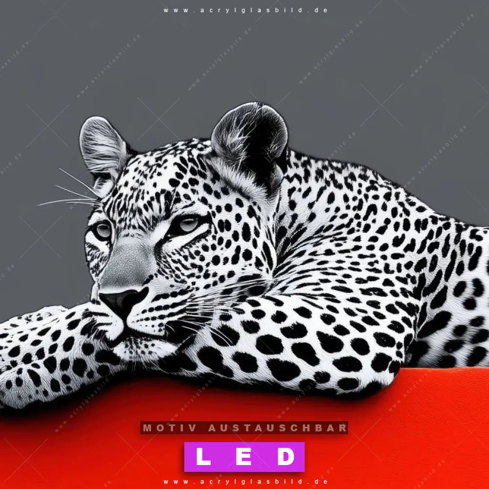Du bist auf der Suche nach einem dimmbaren Tierwelt LED Bild mit Fernbedienung und optionaler Farbtemperatursteuerung? Dann haben wir hier genau das richtige Wandbild mit LED Beleuchtung für dich: Unser Canvalight® DIA LED Acrylglasbild Leopard - Eleganz trifft Abstraktion im Querformat mit austauschbarer bedruckter Acrylglas-Scheibe. Dieses Leuchtbild bringt sofort Partybeleuchtung in deine Räume!