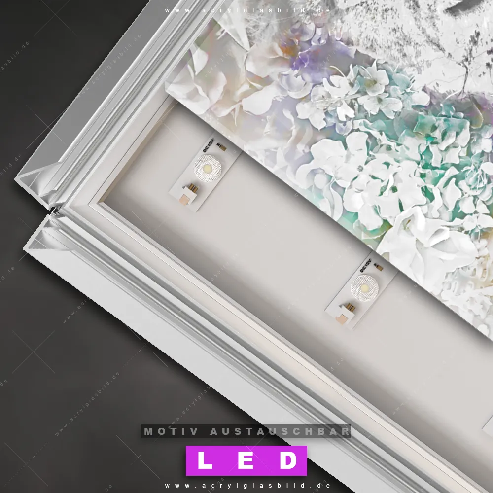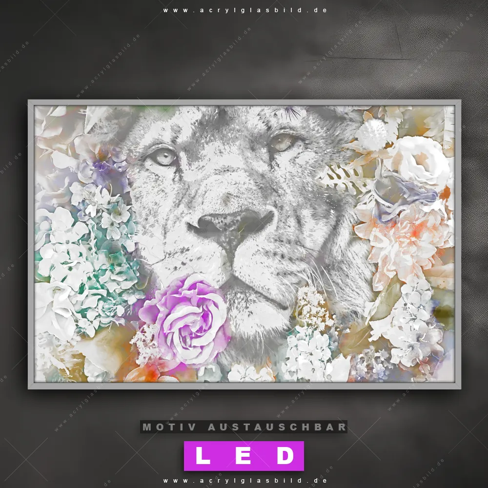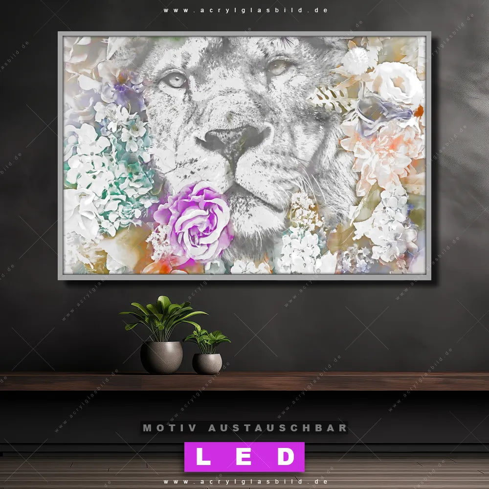 Du bist auf der Suche nach einem dimmbaren Tierwelt, Blumen - Botanik LED Bild mit Fernbedienung und optionaler Farbtemperatursteuerung? Dann haben wir hier genau das richtige Wandbild mit LED Beleuchtung für dich: Unser Canvalight® DIA LED Acrylglasbild Löwe & Blumen im Querformat mit austauschbarer bedruckter Acrylglas-Scheibe. Dieses Leuchtbild bringt sofort Partybeleuchtung in deine Räume!