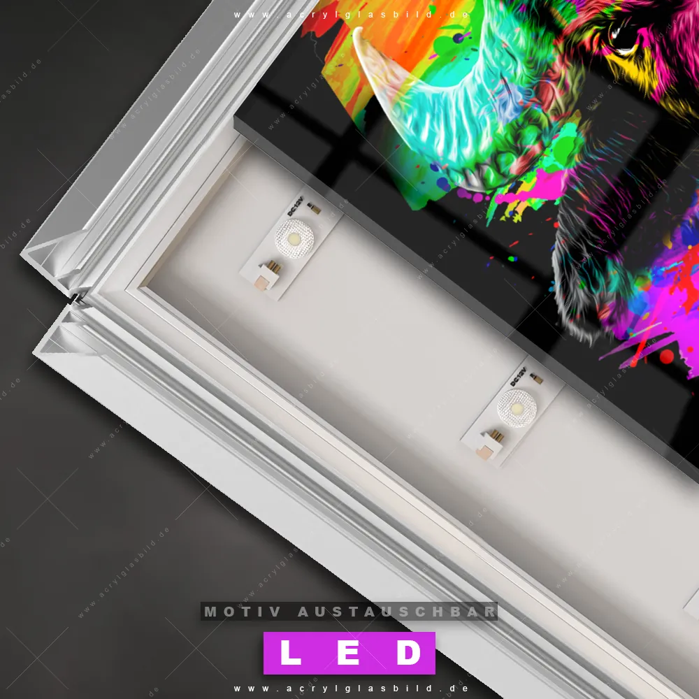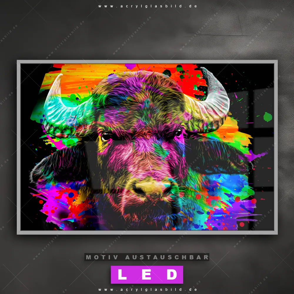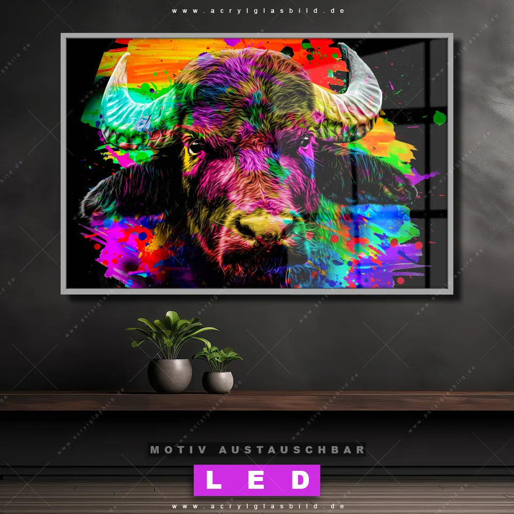 Mit unserem LED Acrylglasbild Canvalight® DIA bunter Stier und seiner genialen LED-Ausleuchtung wirst du nie wieder im Dunkeln auf deinem Sofa herumtappen. Wenn du nach einem beleuchteten Wandbild aus Acrylglas mit Tier, Stier, Hochlandkuh, Highlander, Büffel, Splash, Farbspritzer, Rind, Farbe, Kuh für Bar - Gastronomie, Wohnzimmer - Schlafzimmer, Flur - Eingangsbereich, Büro - Kanzlei suchst, ist unser LED Leuchtbild Stier umhüllt von Farben in den beeindruckenden Motiv-Farben Bunt, Schwarz genau das richtige beleuchtete Wandbild für dich. Gestaltet im Abstrakt, Modern Art, Pop Art Stil, passt dieses LED Wandbild mit DIA-Klapprahmen und glänzender Front aus Acrylglas perfekt zu jedem Einrichtungsstil – sogar zu deinem chaotischen kreativen Durcheinander!