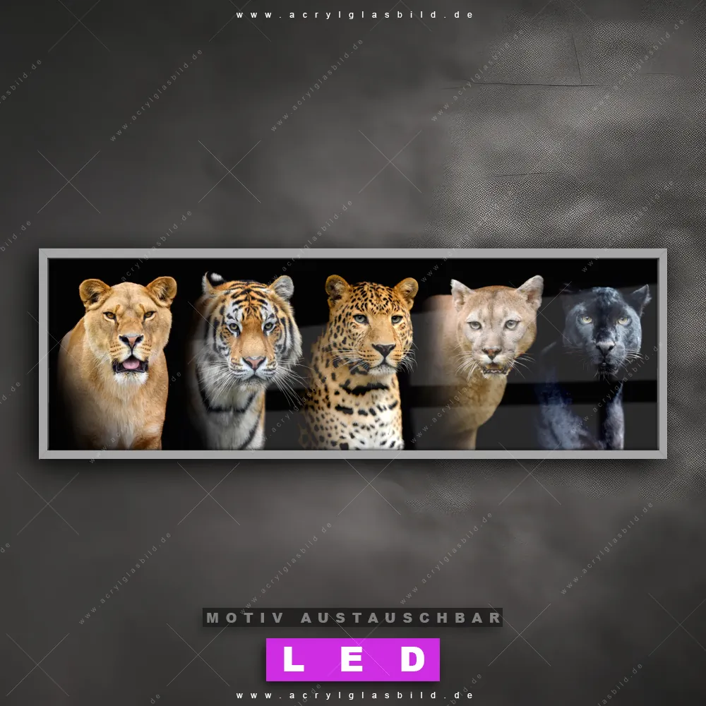Begriffe wie Raubkatze, Leopard, Tiger, Löwe, Panther, Afrika, Dschungel, wild, Safari, Wasser, Wildkatze, Lion haben dich auf der Suche nach deinem neuen LED Wandbild aus Acrylglas inspiriert? Dann sollte das LED Acrylglasbild verschiedene Raubkatzen den Weg zu dir finden.