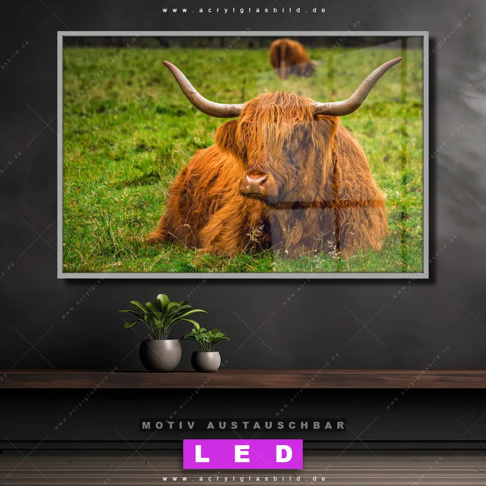 Du bist auf der Suche nach einem dimmbaren Tierwelt LED Bild mit Fernbedienung und optionaler Farbtemperatursteuerung? Dann haben wir hier genau das richtige Wandbild mit LED Beleuchtung für dich: Unser Canvalight® DIA LED Acrylglasbild Rind in den schottischen Highlands im Querformat mit austauschbarer bedruckter Acrylglas-Scheibe. Dieses Leuchtbild bringt sofort Partybeleuchtung in deine Räume!