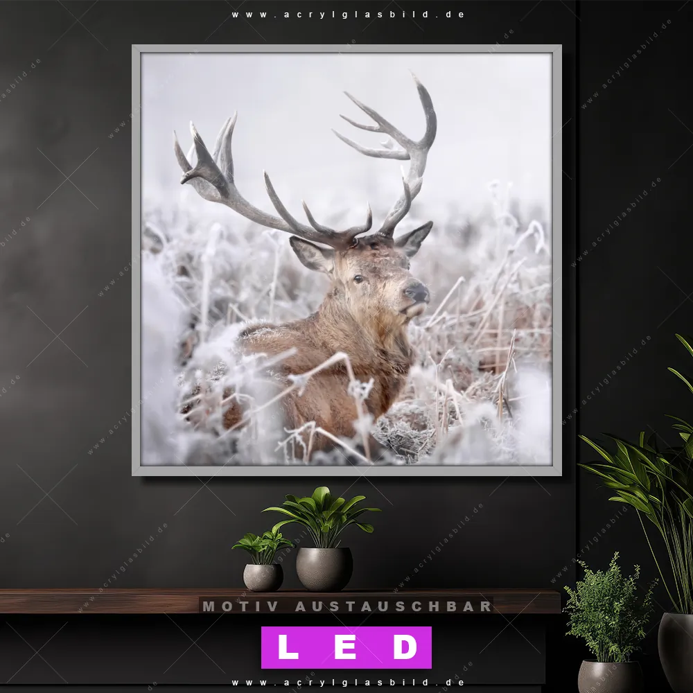 Also, worauf wartest du noch? Gib mit einem beleuchteten Wandbild mit wechselbarer Acrylglas-Scheibe deinen Wänden das gewisse Etwas und bestelle jetzt das LED Acrylglasbild Canvalight® DIA Hirschkopf im winterlichen Gras – dein Zuhause wird es dir danken und deine Freunde werden dank der wechselbaren Motive erblassen!