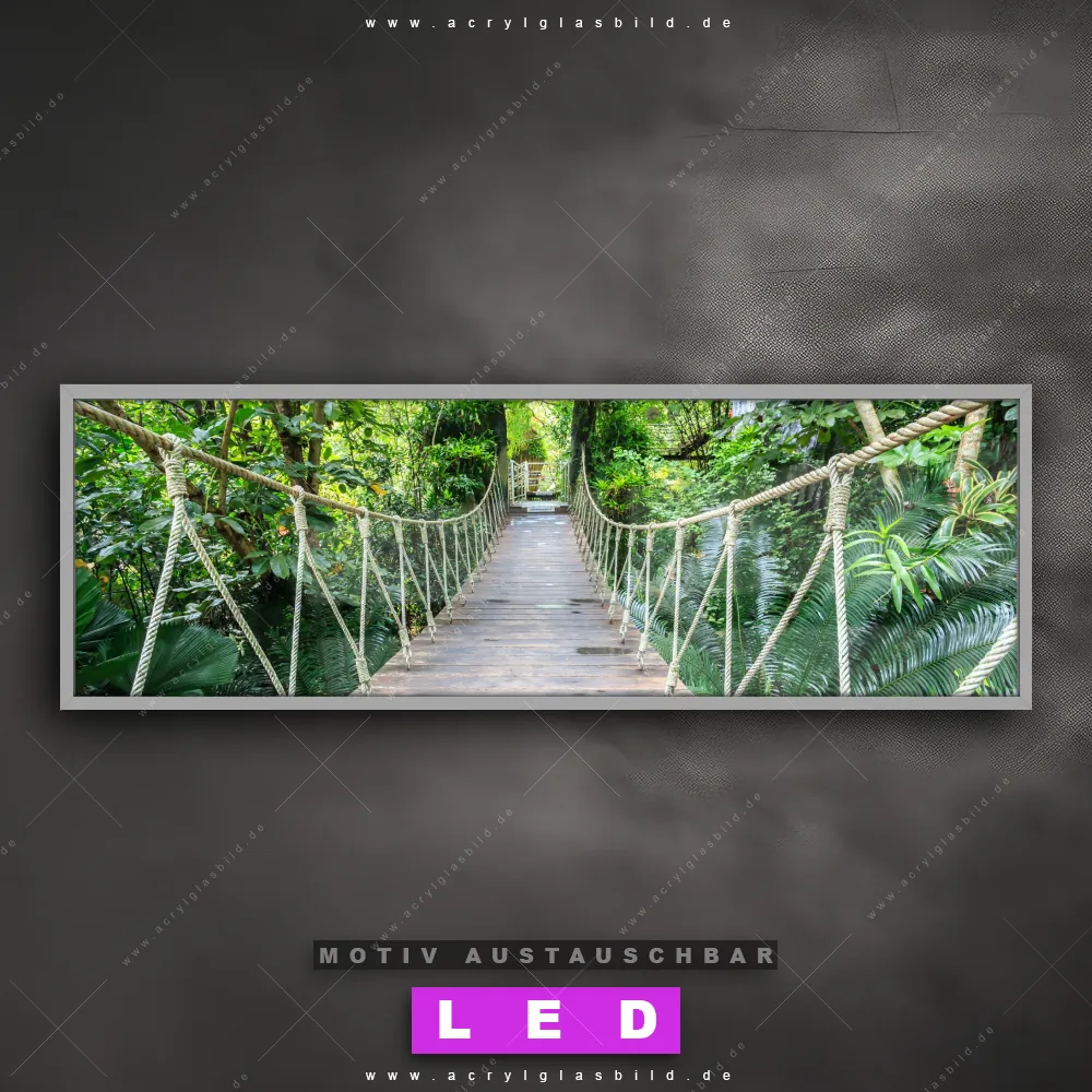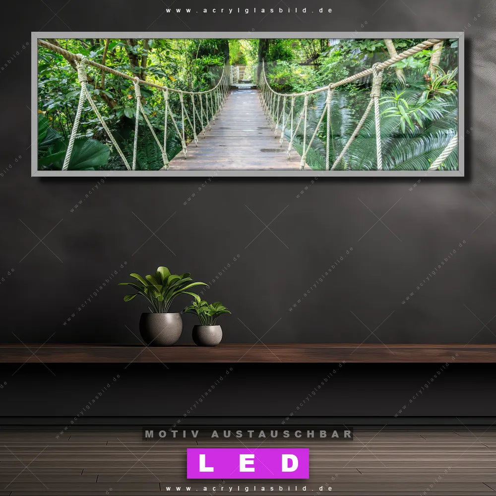 Deine Wände könnten dringend ein dimmbares LED Bild mit Fernbedienung und optionaler Farbtemperatursteuerung gebrauchen? Dann haben wir das perfekte Wandbild mit LED Beleuchtung für dich: unser mega-cooles Landschaften, Wald - Bäume Canvalight® DIA LED Acrylglasbild! Mit unserem angesagten Leuchtbild aus Acrylglas im Panorama-Format und der austauschbaren bedruckten Acrylglas-Scheibe Hängebrücke im Dschungel bringst du nicht nur Licht, sondern auch jede Menge Flair in deine Räume.