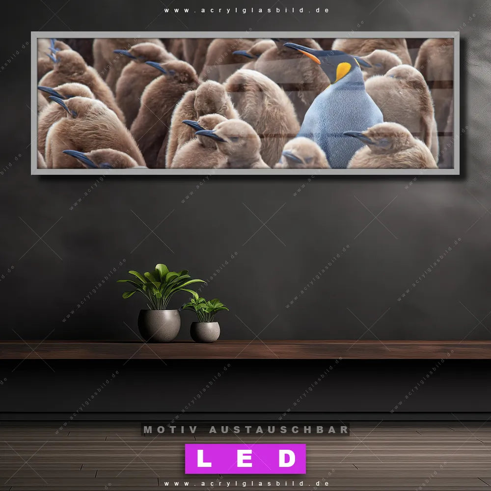 Deine Wände könnten dringend ein dimmbares LED Bild mit Fernbedienung und optionaler Farbtemperatursteuerung gebrauchen? Dann haben wir das perfekte Wandbild mit LED Beleuchtung für dich: unser mega-cooles Tierwelt Canvalight® DIA LED Acrylglasbild! Mit unserem angesagten Leuchtbild aus Acrylglas im Panorama-Format und der austauschbaren bedruckten Acrylglas-Scheibe Königspinguine bringst du nicht nur Licht, sondern auch jede Menge Flair in deine Räume.