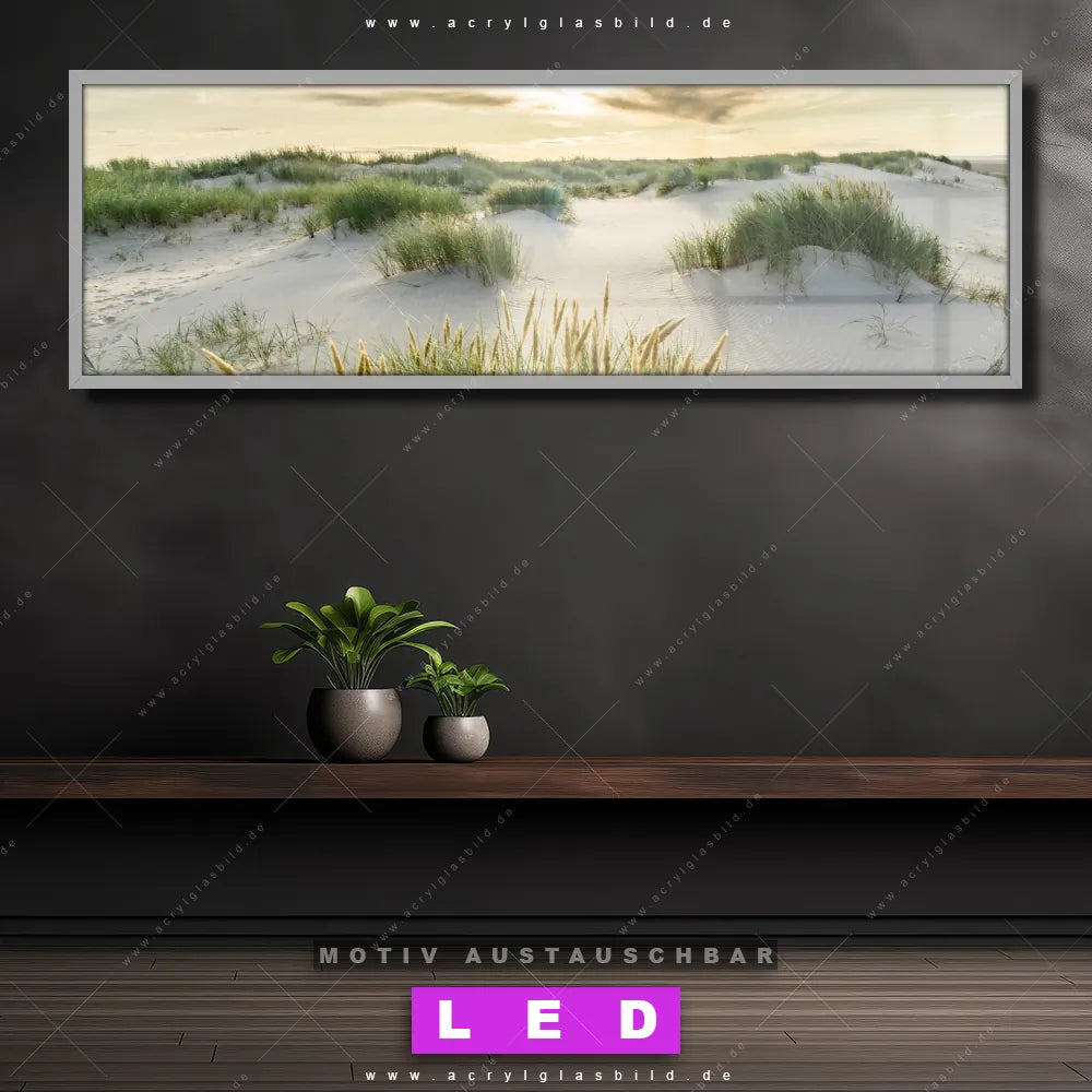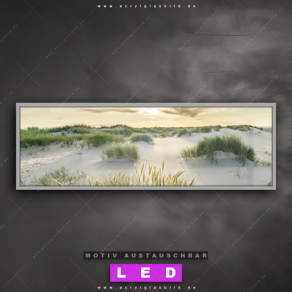 Deine Wände könnten dringend ein dimmbares LED Bild mit Fernbedienung und optionaler Farbtemperatursteuerung gebrauchen? Dann haben wir das perfekte Wandbild mit LED Beleuchtung für dich: unser mega-cooles Landschaften, Strand - Meer Canvalight® DIA LED Acrylglasbild! Mit unserem angesagten Leuchtbild aus Acrylglas im Panorama-Format und der austauschbaren bedruckten Acrylglas-Scheibe Strand mit Sanddünen bringst du nicht nur Licht, sondern auch jede Menge Flair in deine Räume.