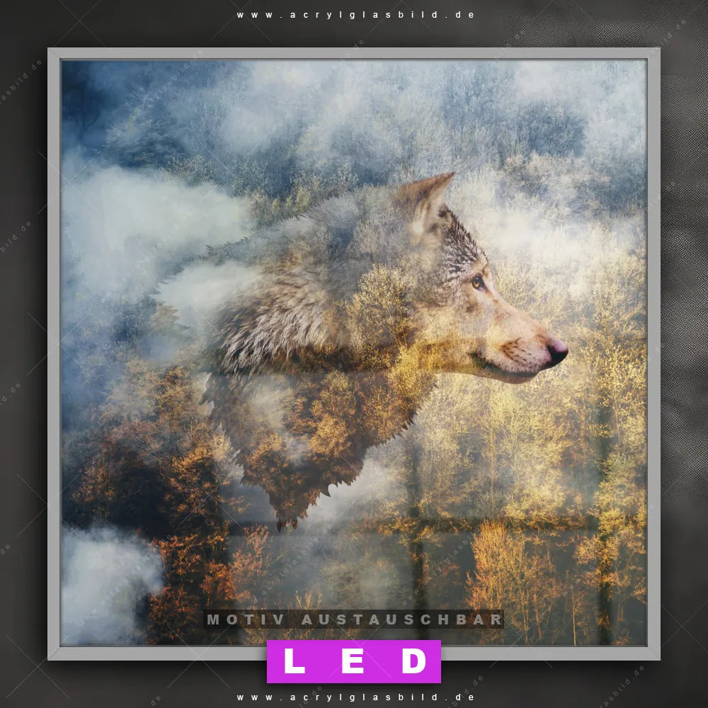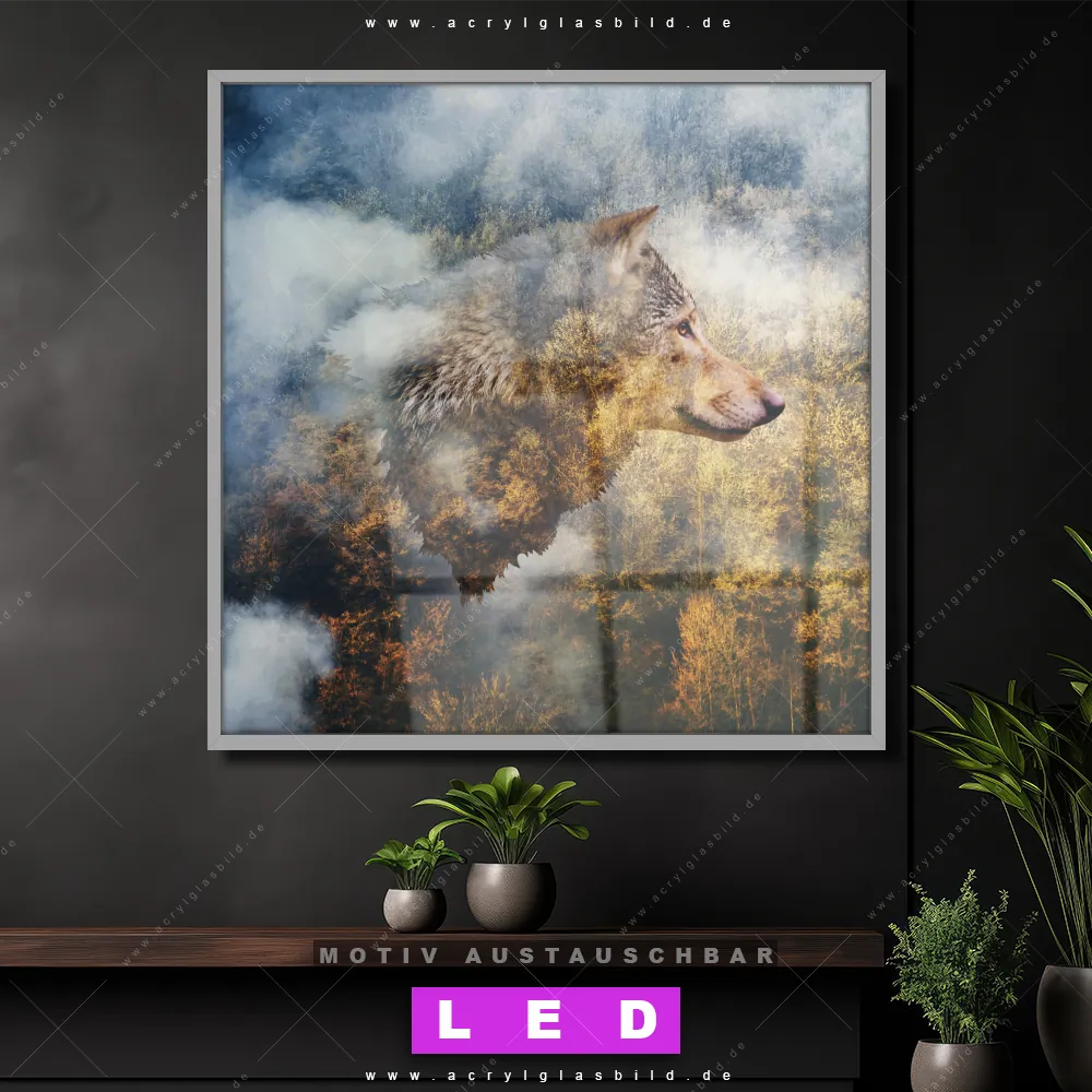 Bist du bereit, deine Wände mit einem dimmbaren LED Bild mit Fernbedienung und optionaler Farbtemperatursteuerung zum Leuchten zu bringen? Wir haben das ultimative Tierwelt LED Acrylglasbild Canvalight® DIA für dich! Unser LED Wandbild aus Acrylglas Wolf & Wald No.2 im Quadratischen Format mit austauschbarer bedruckter Acrylglas-Scheibe im DIA-Klapprahmen bringt sofort jede Menge Glanz in deine vier Wände.