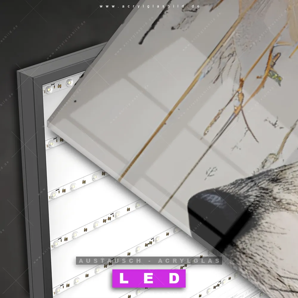 Begriffe wie Wolf, Wald, Raubtier, Porträt, Hund, Rüde, Kopf, Kunst, Farbe, Spritzer, Farbspritzer, Acryl haben dich auf der Suche nach deinem neuen Austausch-Acrylglasbild inspiriert? Dann sollte das Wechsel-Acrylglasbild Wolfskopf gold-grau für dein bereits vorhandenes LED Acrylglasbild Canvalight® DIA den Weg zu dir finden.